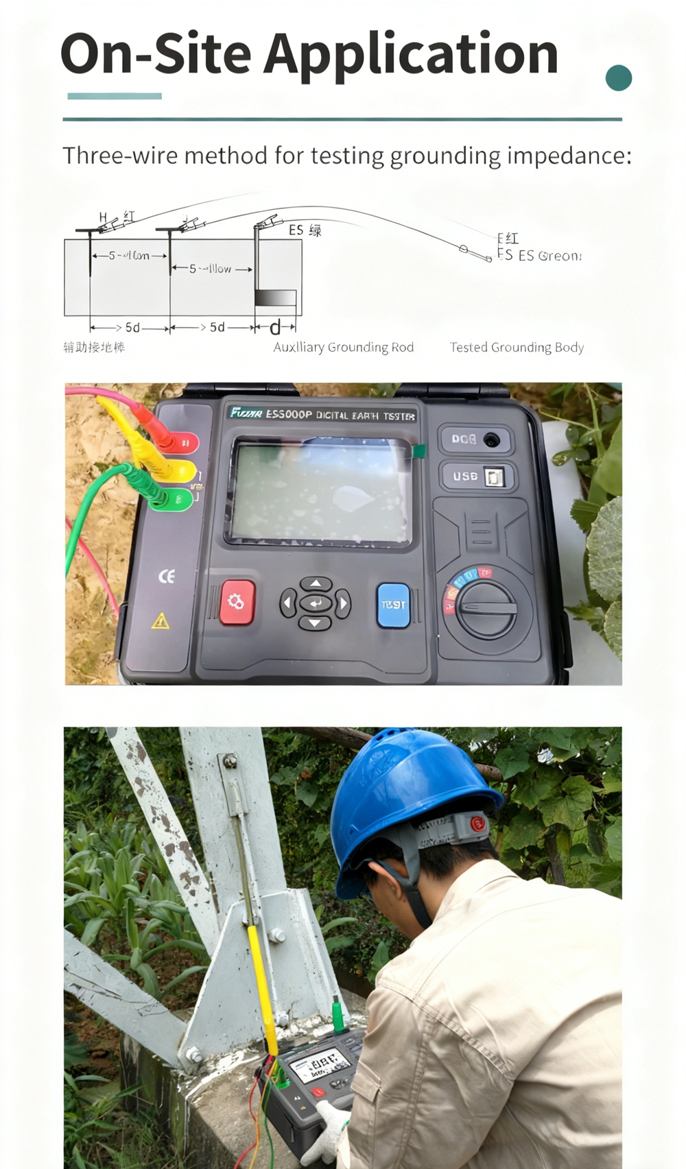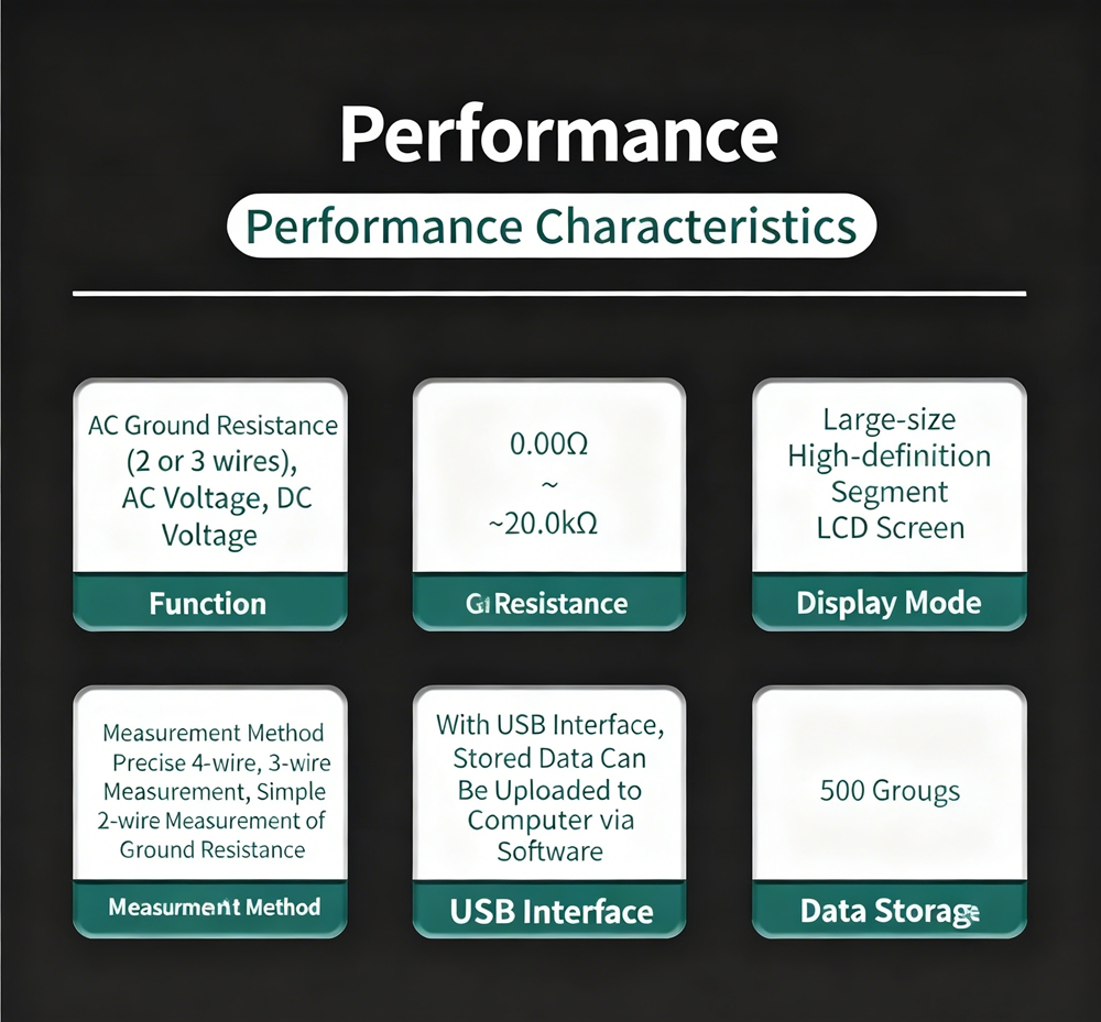 - Measurement method: three wire method measurement, simple two-wire measurement of grounding resistance
