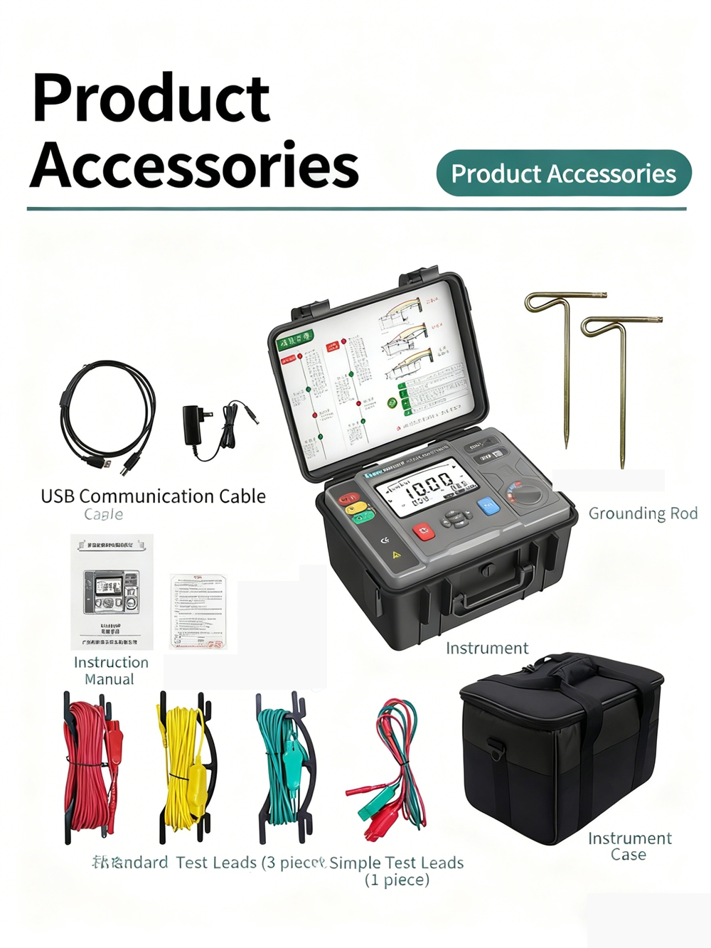 - The multifunctional ground resistance tester consists of a host computer, upper computer software, mobile APP software, testing cable, USB cable, charger, and grounding pin.