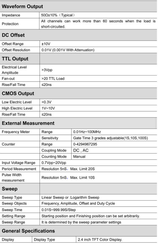 - Sweep Function: It can sweep 4 properties of signals including frequency, amplitude, offset and duty cycle. It has Linear and Logarithm two sweep types. Sweep time can be up to 999.99S. Sweep starting point and end point can be set arbitrarily.