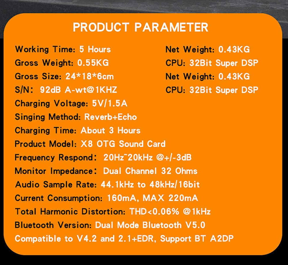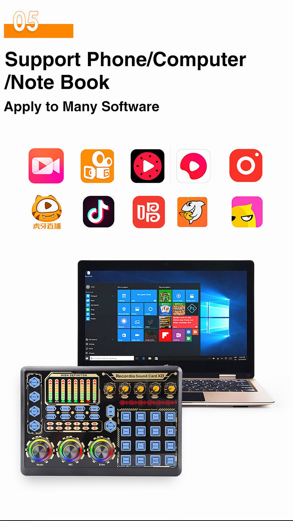 - 8 kinds of effect method (Host, Sing, Professional, Rap, V Cut, Dodge, Denoise, Monitor, Changer, electronic Sound)
