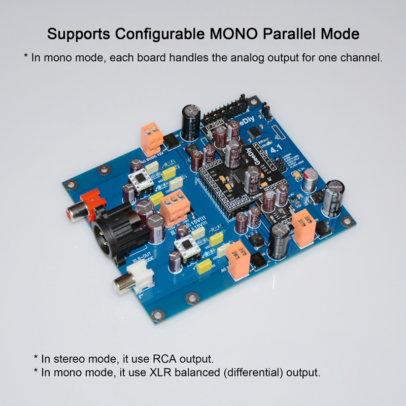 It supports parallel mode (mono mode), where each board handles one channel. By default, it is in stereo mode, but it can be switched to mono mode via the board's K port.
