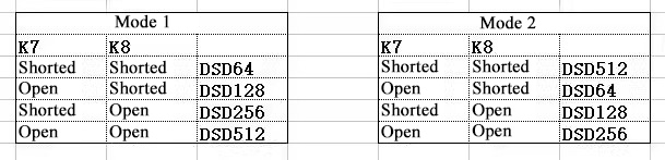 Mode 1 is the default mode. Mode 2 is used to work with the Italian interface (for Amanero) to enable automatic DSD sampling rate switching. When you are using Mode 2, K7 connects to pin 17 of the Italian interface and K8 connects to pin 18 of the Italian interface.