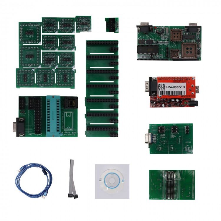 Upa-usb 2012 is the full set with all adapters,The main Device can be directly connected to the Elrasoft.com UUSP (UPA-USB Serial Programmer) or by an optional DB9 male / female 1:1 extension cable. It's equipped with an 40pin ZIF Socket for all narrow and wide DIP / DIL devices as well as with a 16 pin SOIC ZIF (150mil, narrow) socket to cover most commonly used devices.