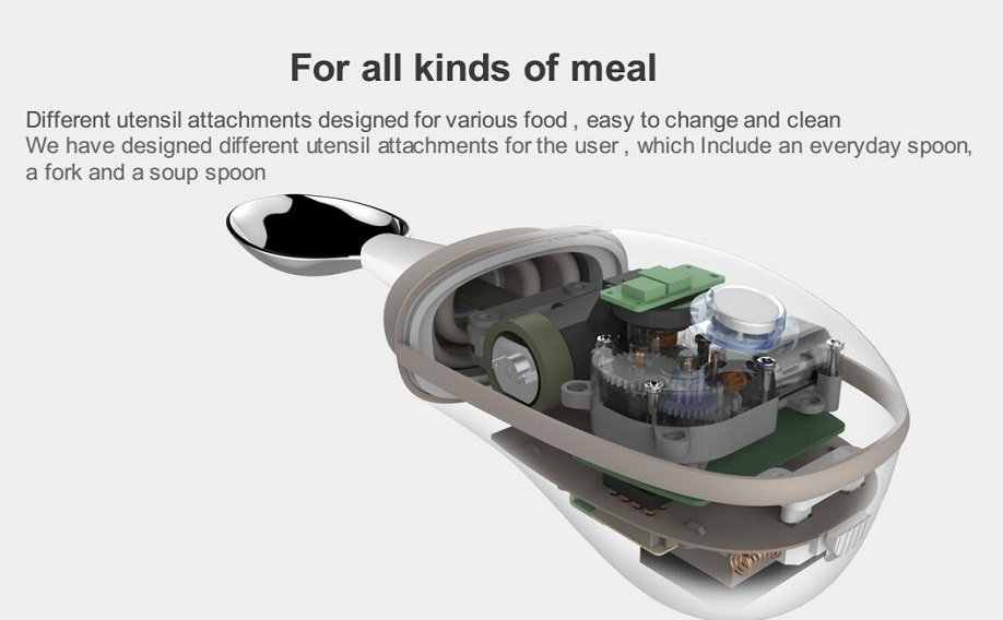 - FOR ALL KINDS OF MEALS: Different utensil attachments designed for various food, easy to change. Having designed different utensil attachments for the user, which include an everyday spoon, a fork and a soup spoon.