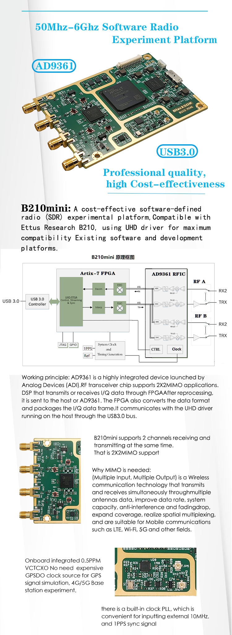 - B210 mini: A cost-effective software defined radio (SDR) experimental platform that is compatible with Ettus Research B210 and uses UHD drivers to maximize compatibility with existing software and development platforms.
