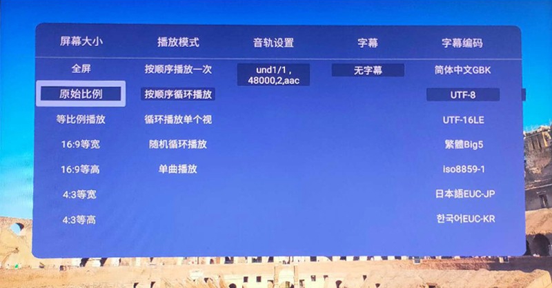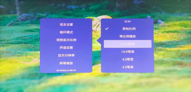 - Optional: full screen, original ratio, proportional playback, 16:9 equal width, 16:9 equal height, 4:3 equal width, 4:3 equal height.