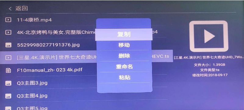 - Insert a USB flash drive or storage card into the player, open the homepage, select the folder option, choose the file, press the OK button on the remote control, and select the corresponding option.