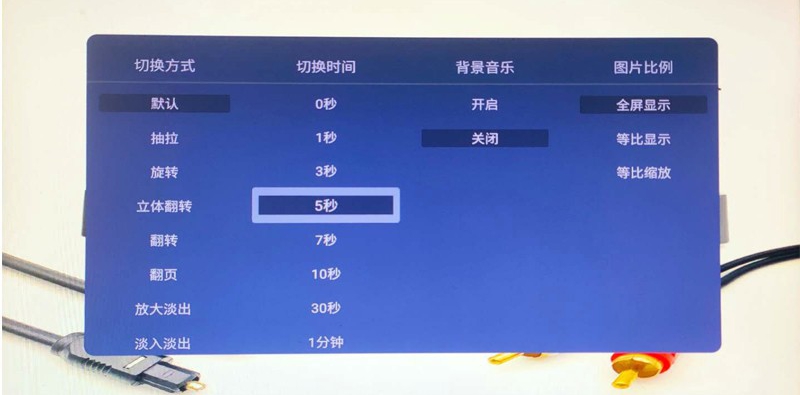 During the process of playing images, press the OK button to select the image switching mode, image interval time, background music, and image ratio.