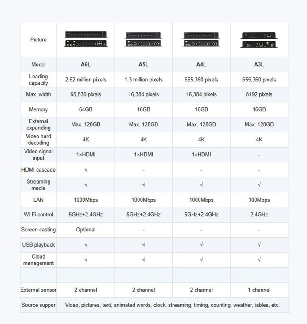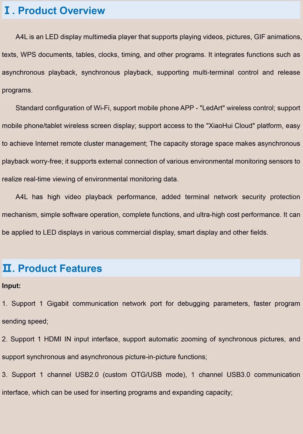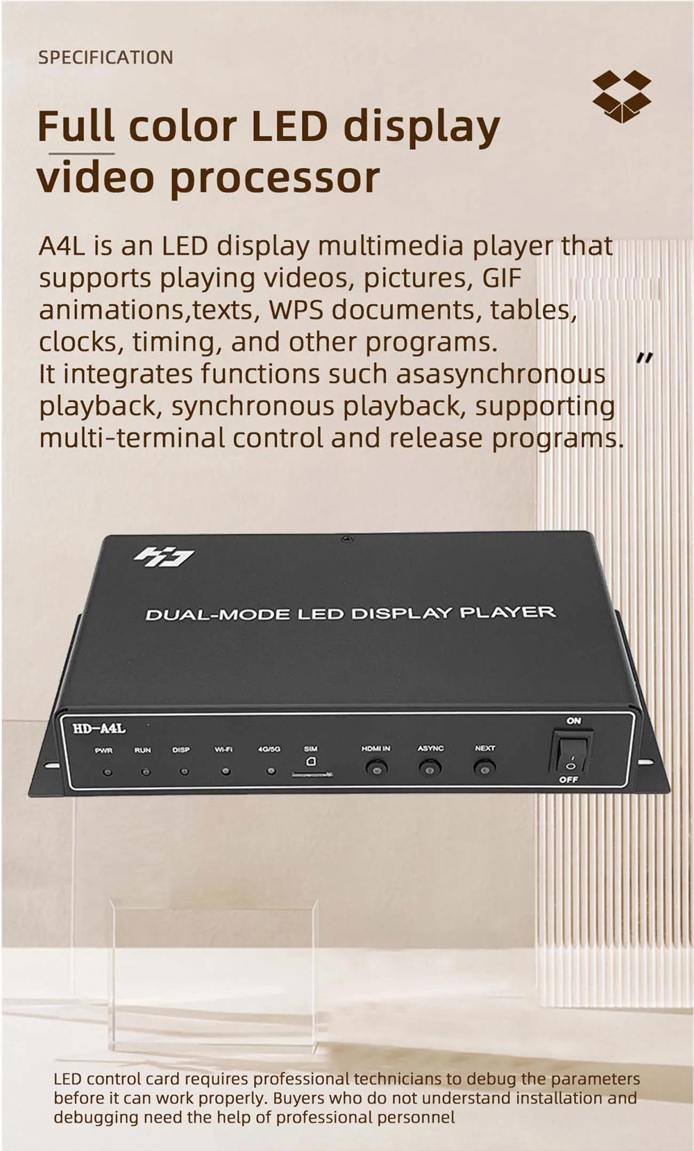 - A4L has high video playback performance, added terminal network security protection mechanism, simple software operation, complete functions, and ultra-high cost performance. It can be applied to LED displays in various commercial display, smart display and other fields.