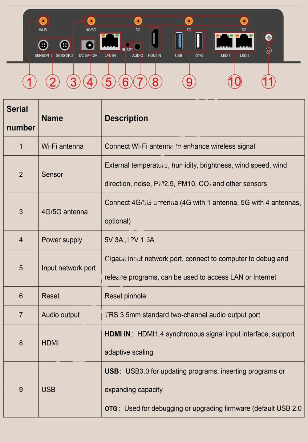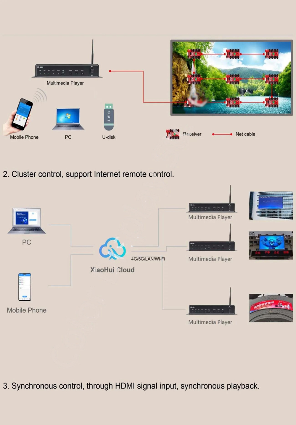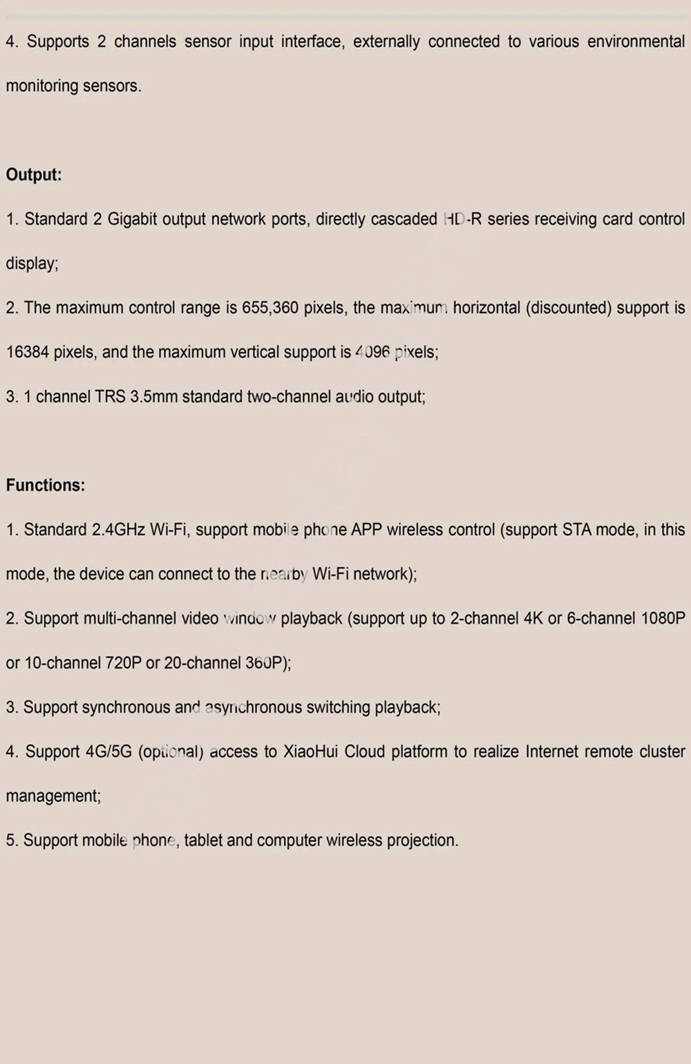 - Standard configuration of WiFi, support mobile phone APP - “LedArt” wireless control; support access to the “XiaoHui Cloud” platform, easy to achieve Internet remote cluster management; The capacity storage space makes asynchronous playback worry-free; it supports external connection of various environmental monitoring sensors to realize real-time viewing of environmental monitoring data.