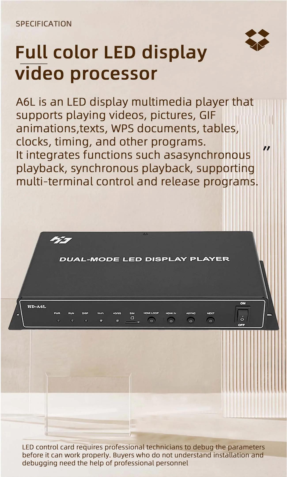 - A6L is an LED display multimedia player that supports playing videos, pictures, GIF animations, texts, WPS documents, tables, clocks, timing, and other programs. It integrates functions such as asynchronous playback, synchronous playback, supporting multi-terminal control and release programs.