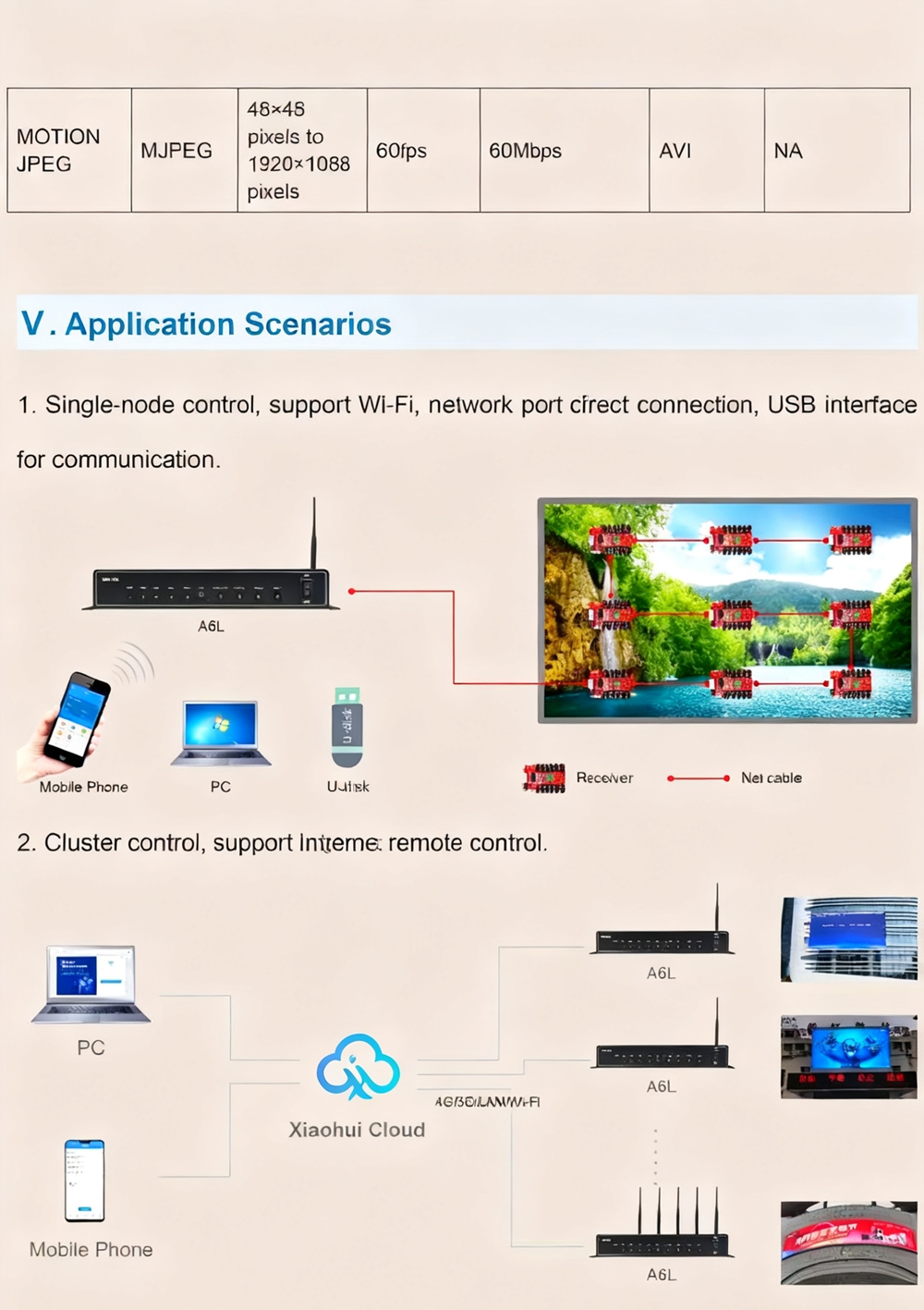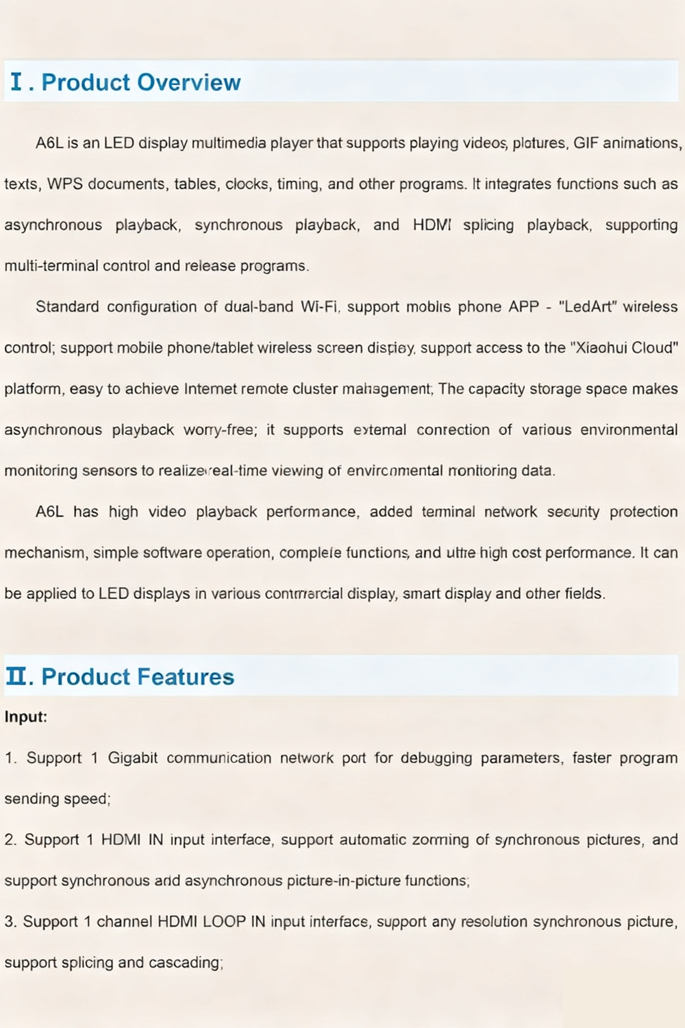 - A6L has high video playback performance, added terminal network security protection mechanism, simple software operation, complete functions, and ultra-high cost performance. It can be applied to LED displays in various commercial display, smart display and other fields.