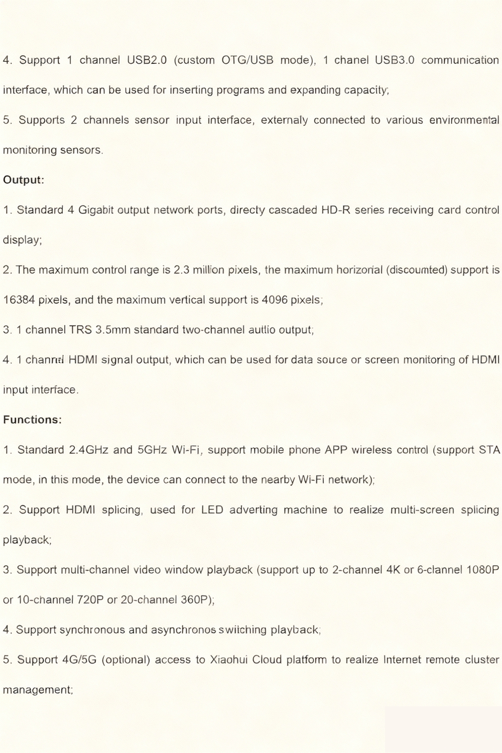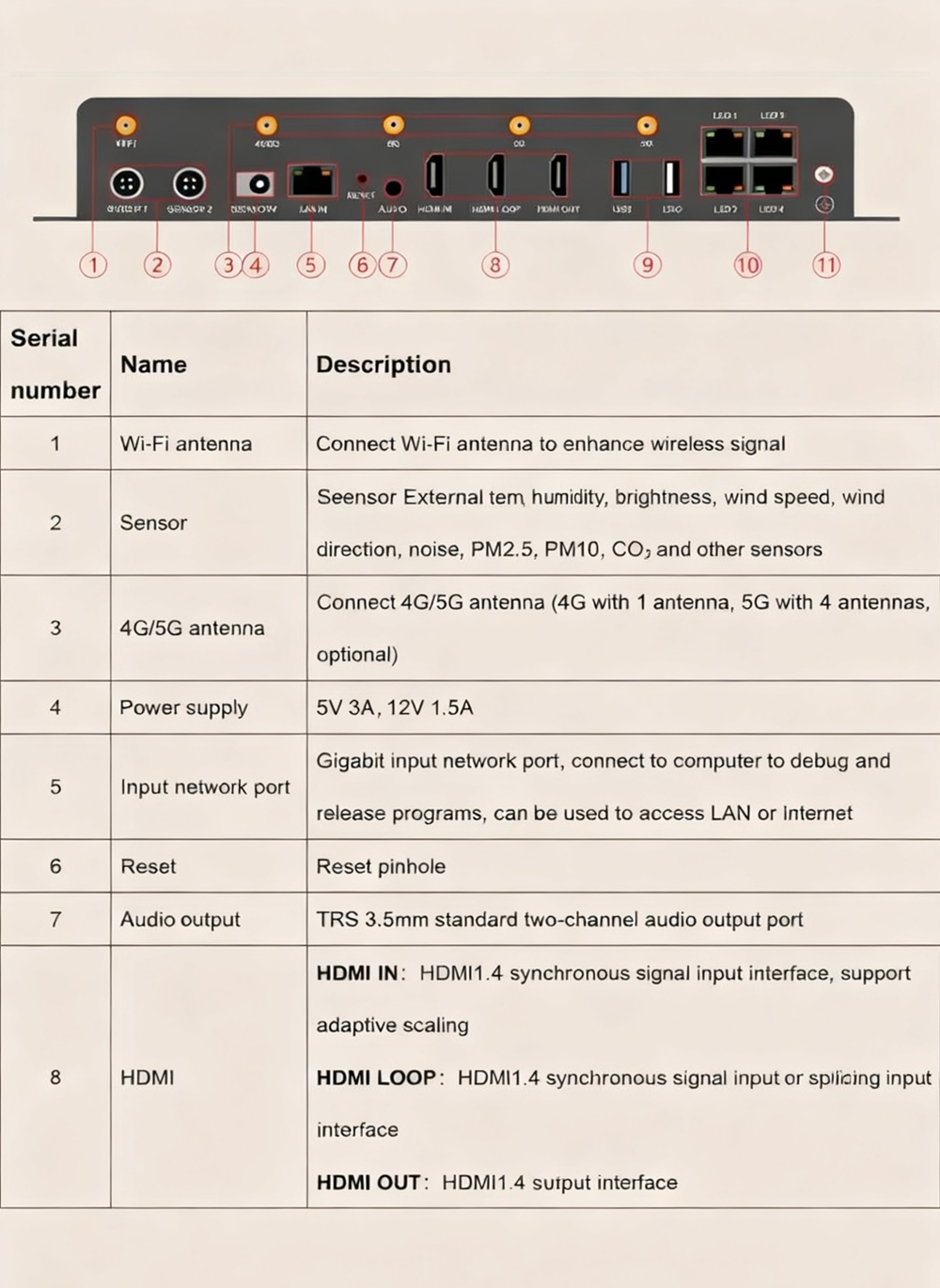 - Standard configuration of WiFi, support mobile phone APP - “LedArt” wireless control; support access to the “XiaoHui Cloud” platform, easy to achieve Internet remote cluster management; The capacity storage space makes asynchronous playback worry-free; it supports external connection of various environmental monitoring sensors to realize real-time viewing of environmental monitoring data.