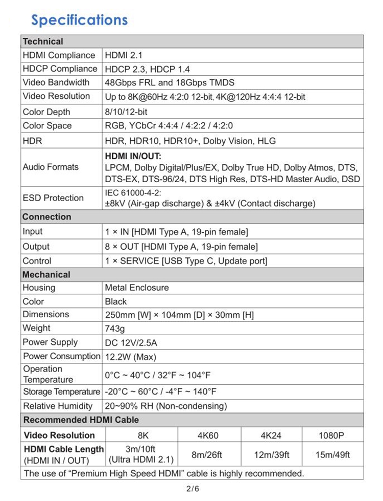 - Support 48Gbps FRL and 18Gbps TMDS video bandwidth.