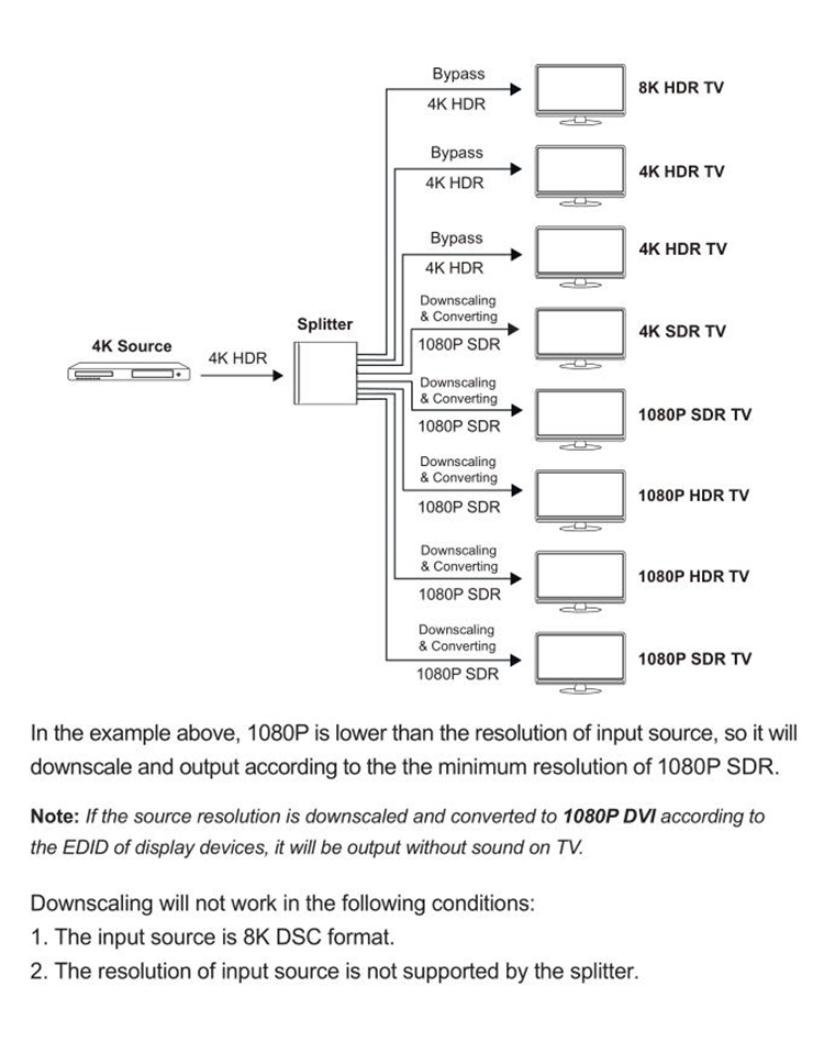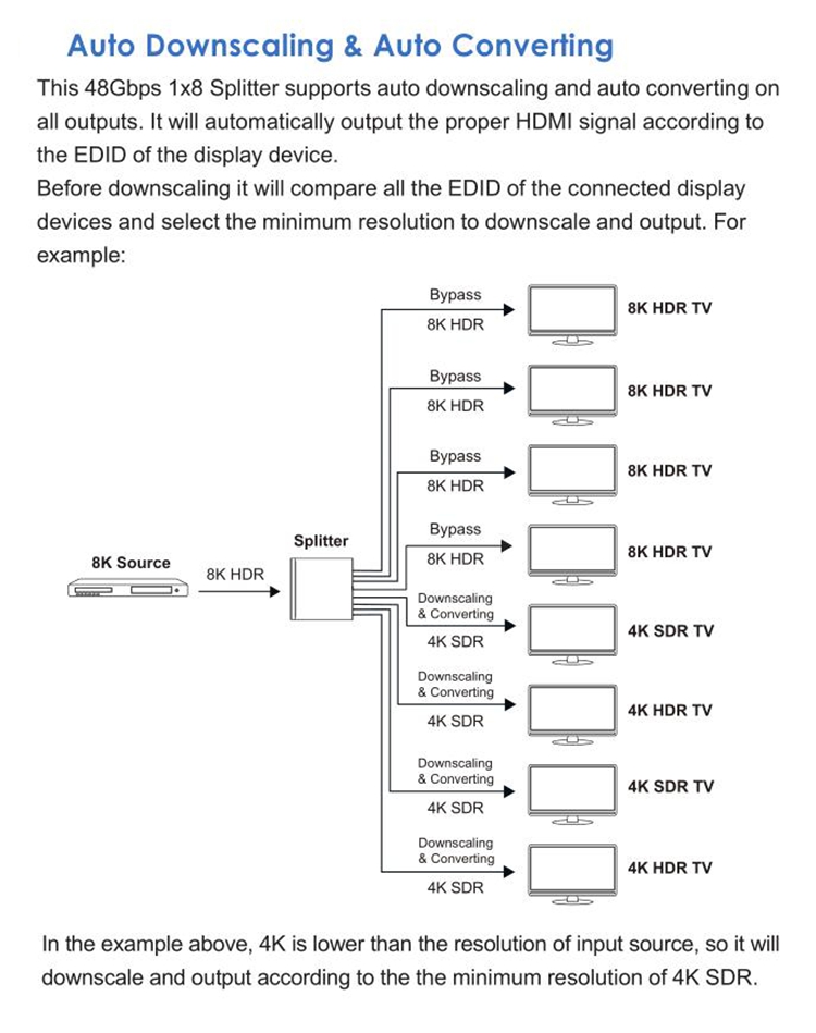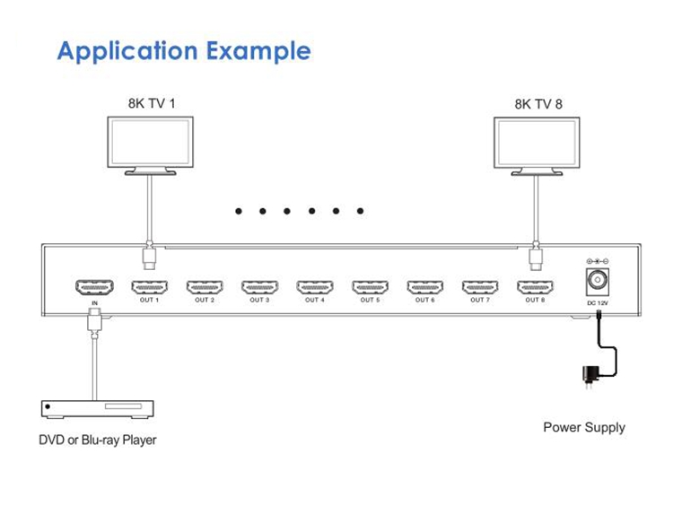 - This 1x8 splitter is an advanced solution for splitting single HDMI-compatible signal to 8 HDMI-compatible outputs synchronously, with video resolution up to 8K at 60 4:2:0 12bit.