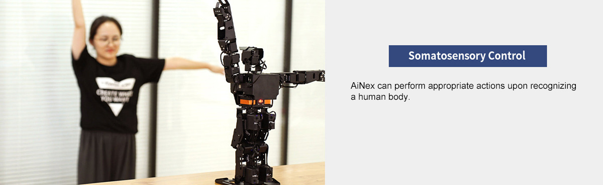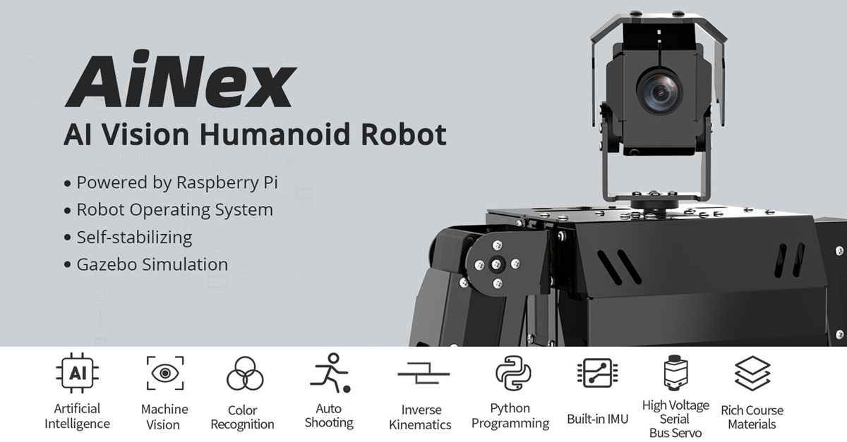 The AiNex small humanoid robot is controlled by a Raspberry Pi and is