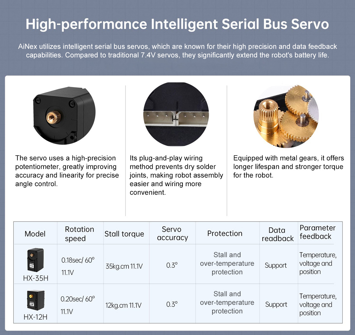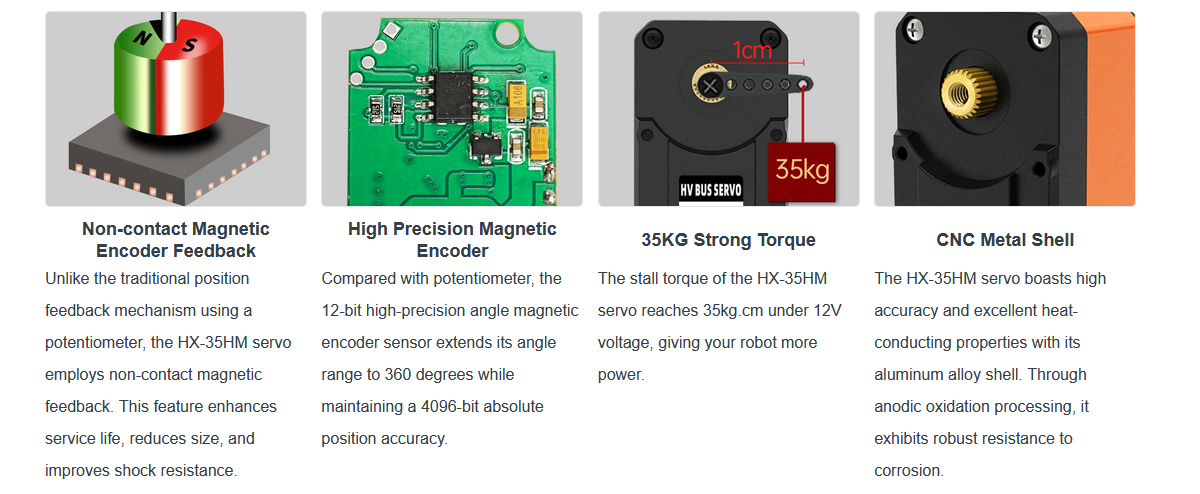 * Intelligent Servo: HX-35H serial bus servo; HX-35HM magnetic encoder serial bus servo; HX-12H serial bus servo