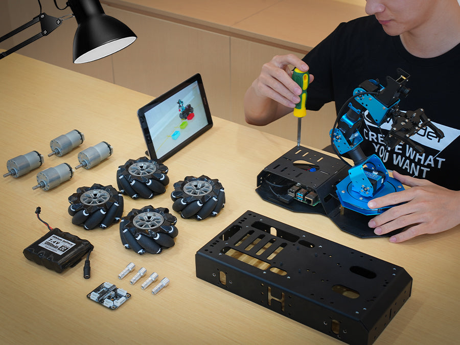 The vision robotic arm comes pre-assembled, while the Mecanum-wheel