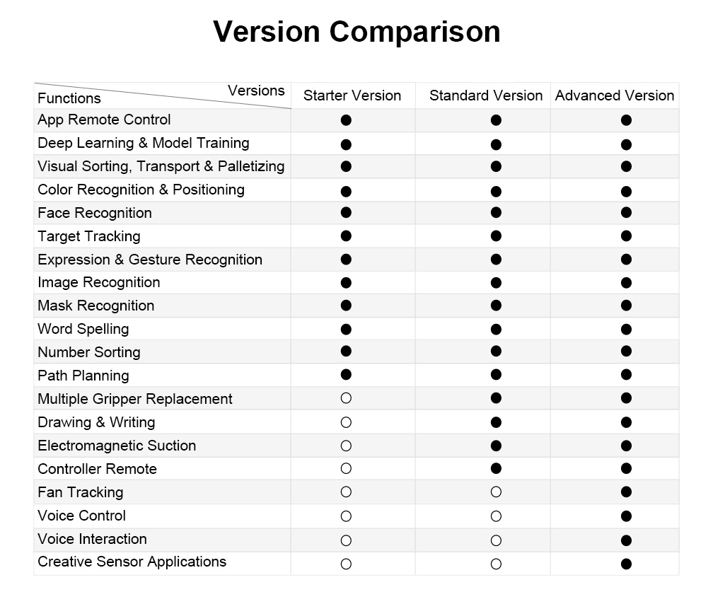 * The robotic arm is delivered fully assembled. For specific version differences, please refer to the product details.