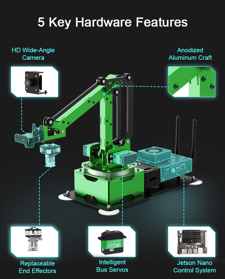 * With Jetson Nano as the main controller, the JetMax robotic arm can achieve powerful functions including image recognition, object detection and positioning, pose estimation, semantic segmentation, and intelligent analysis.