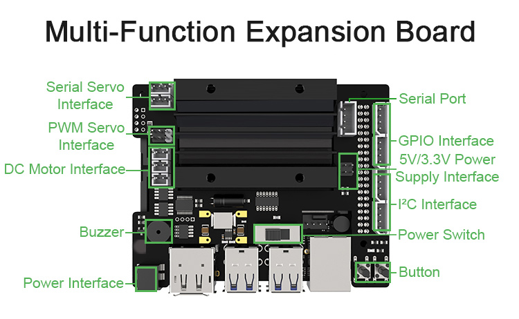 * JetMax is compatible with various modules such as speech recognition, speech synthesis, fan module, dot-matrix display, and ultrasonic sensor, enabling more imaginative AI projects.