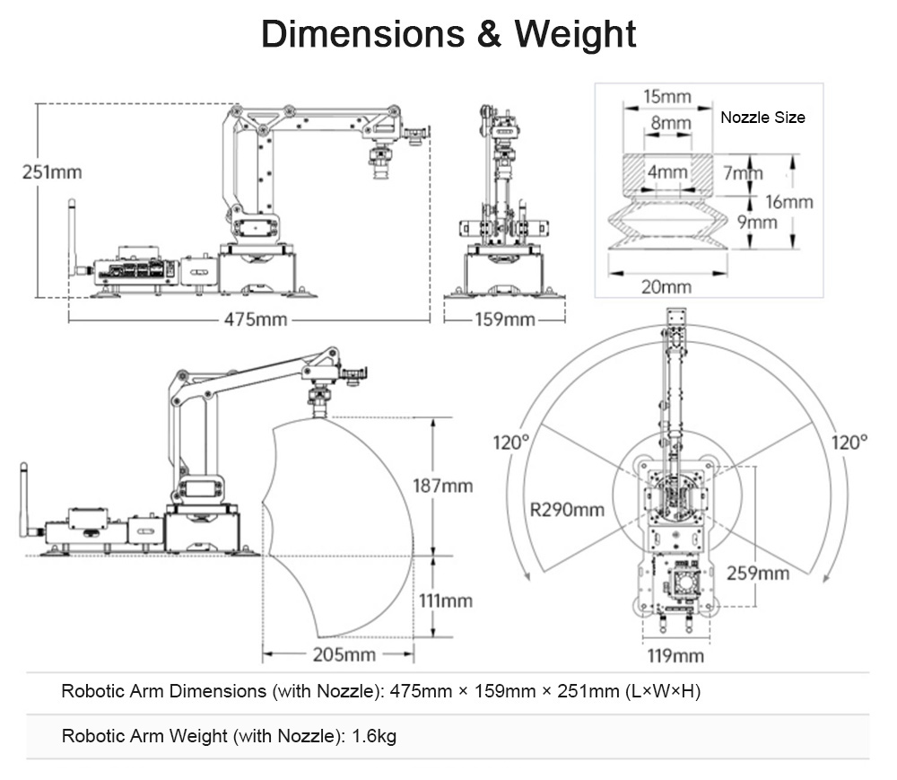 * End Effectors: Supports electric suction nozzle, electromagnetic suction cup, large gripper, small gripper, pen holder