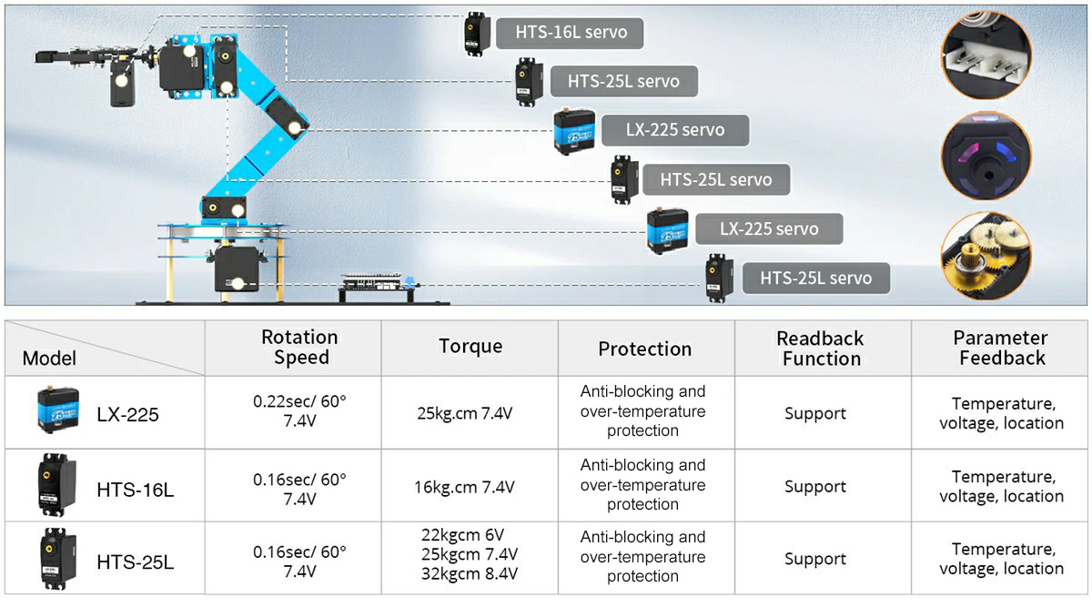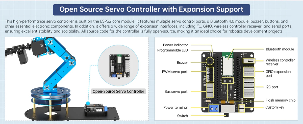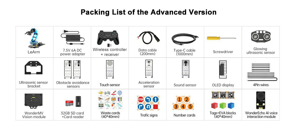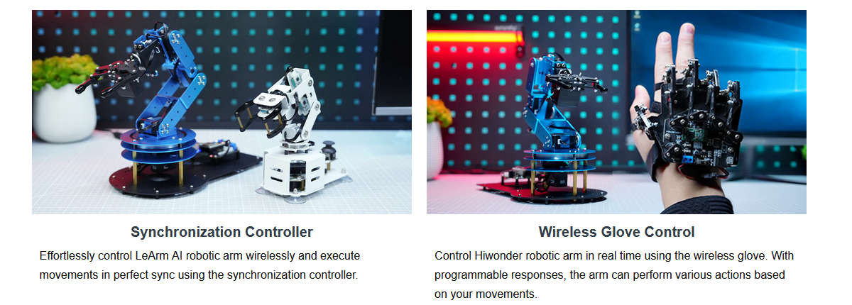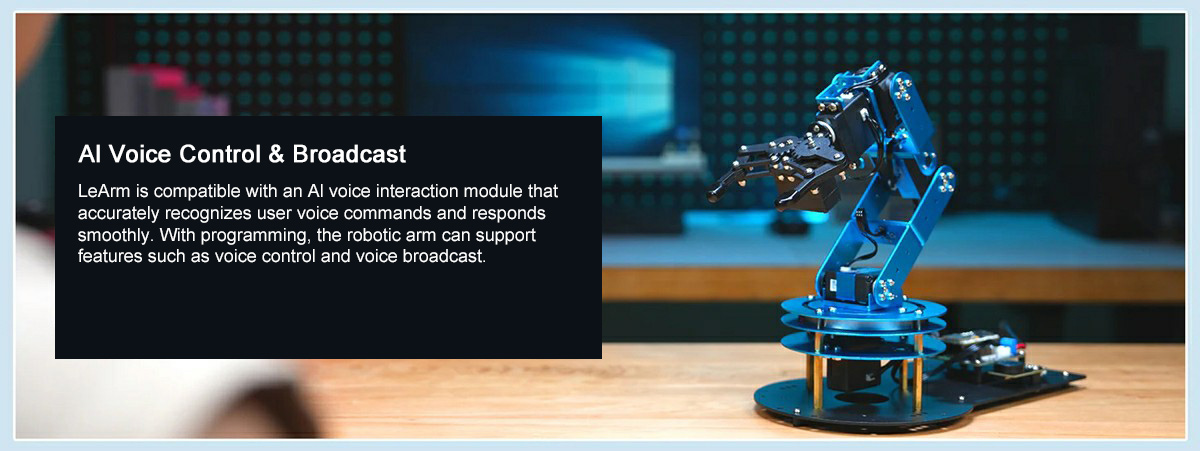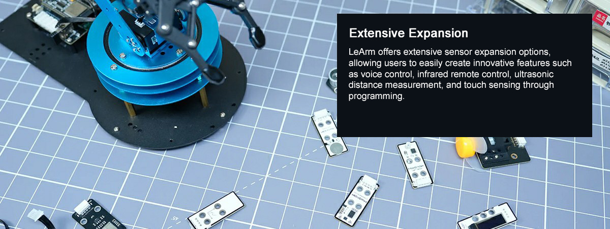 2. The robotic arm can be expanded with various sensor modules, such as AI vision, AI voice, ultrasound, and acceleration sensors, enabling secondary development.