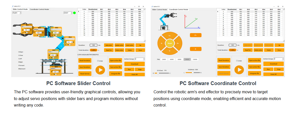 LeArm supports multi-modal expansion and, when combined with Mecanum wheels or a track chassis, can transform into a mobile handling robot, enabling mobile grabbing and intelligent transportation. It also supports the addition of electric sliding rails and conveyor belts, making it possible to build collaborative dual-arm systems, waste sorting, and other automation projects, making it suitable for a wide range of application scenarios!