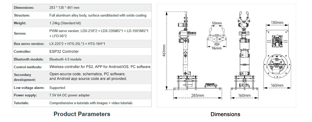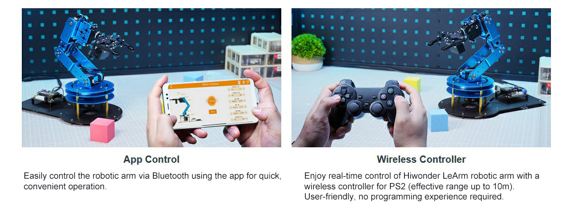 LeArm is a full-stack open-source robotic arm developed by Hiwonder for educational applications. It comes with Bluetooth 4.0 built-in, supporting various communication methods such as mobile apps, game controllers, and motion-sensing gloves. The robotic arm can be paired with Hiwonder smart bus servos. And with the built-in inverse kinematics algorithm, precise control of the arm can be easily achieved by simply inputting coordinates!