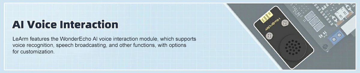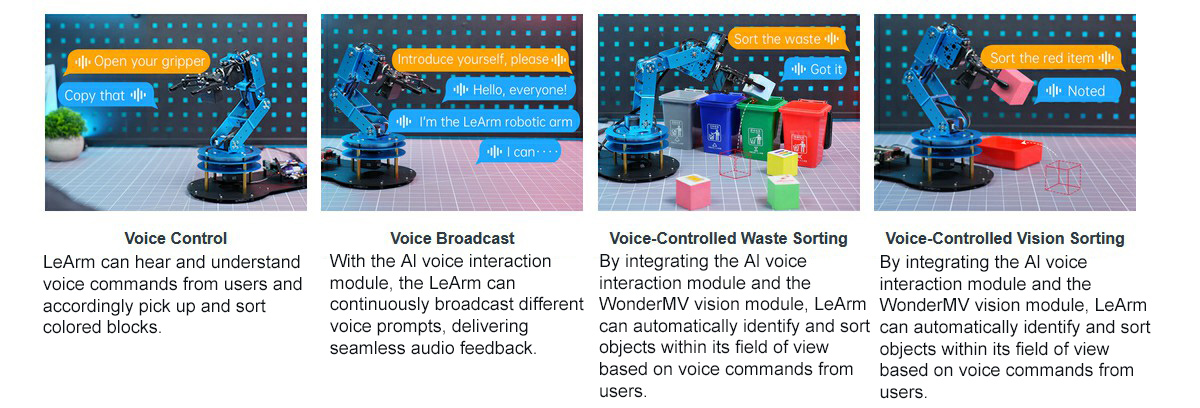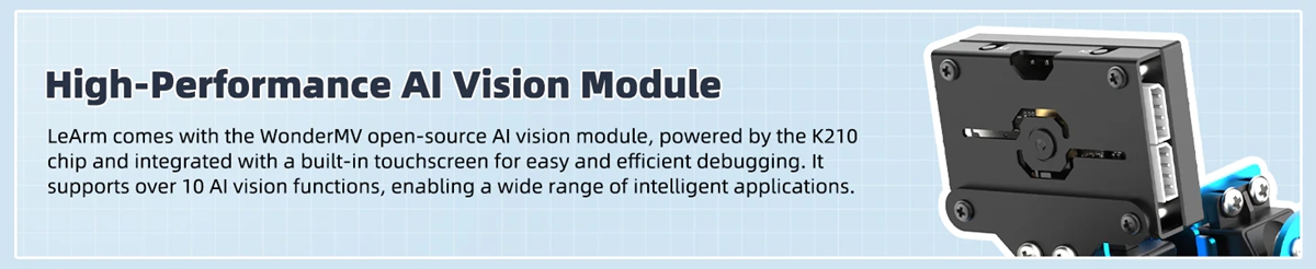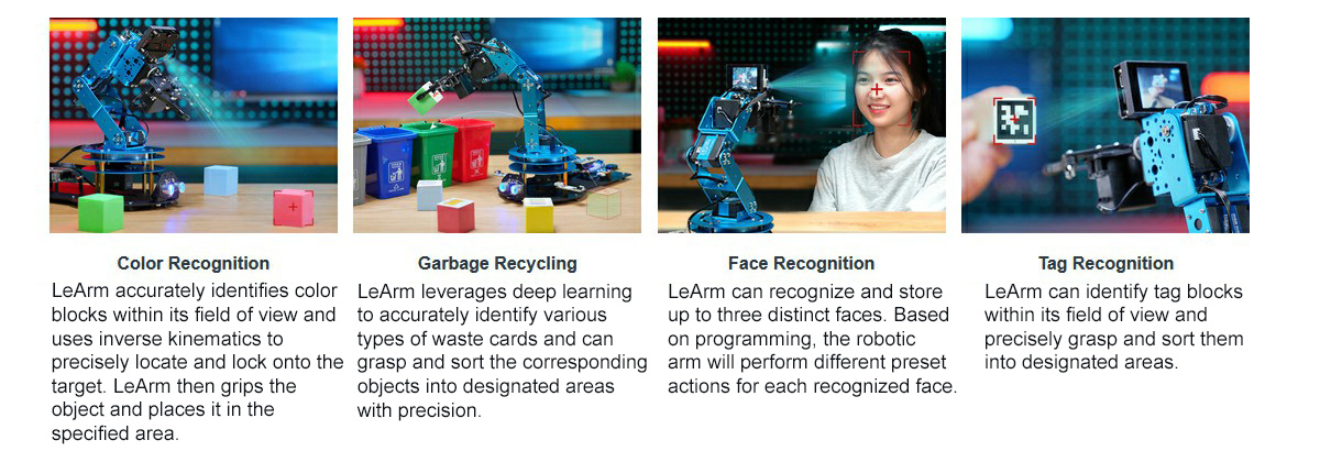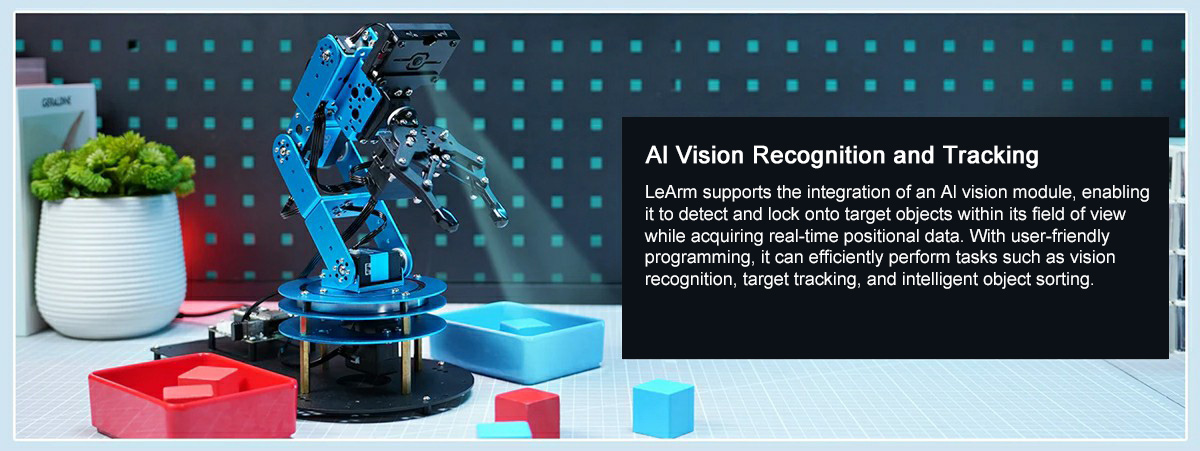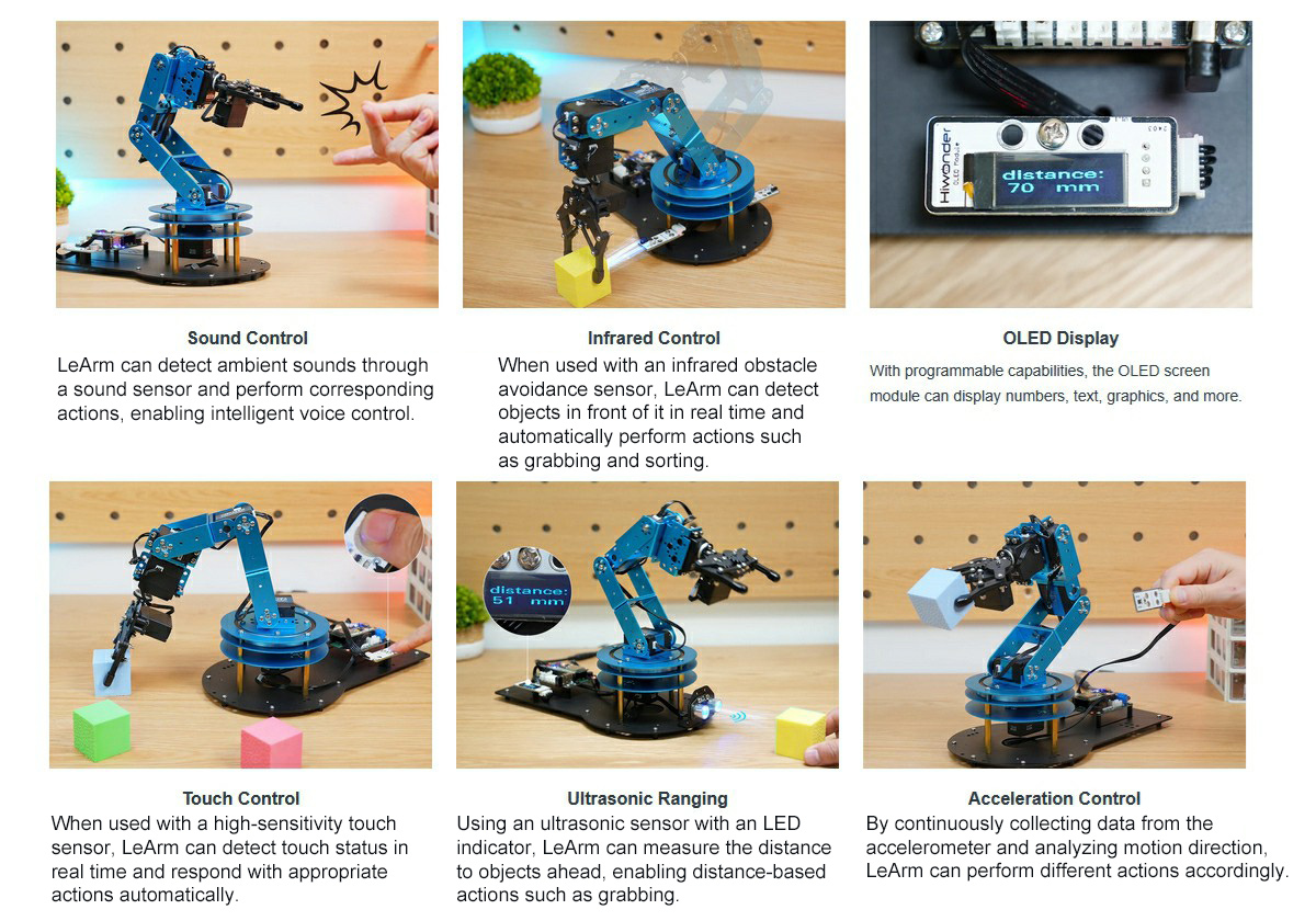 LeArm can be equipped with the K210 vision module, AI voice interaction module, and a wide range of sensors, providing exceptional sensory capabilities such as vision, hearing, and touch. It unlocks a variety of creative interactive features, including visual recognition, target tracking, intelligent sorting, natural voice interaction, and sensor expansion.