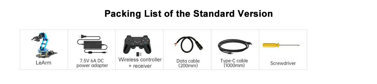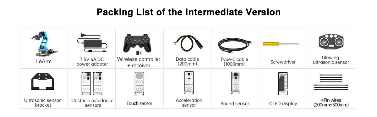 * The following accessories are not included: motion sensing gloves, synchronization teach pendant, omni-wheel chassis, track chassis, electric sliding rail, and electric conveyor belt. These can be purchased separately.