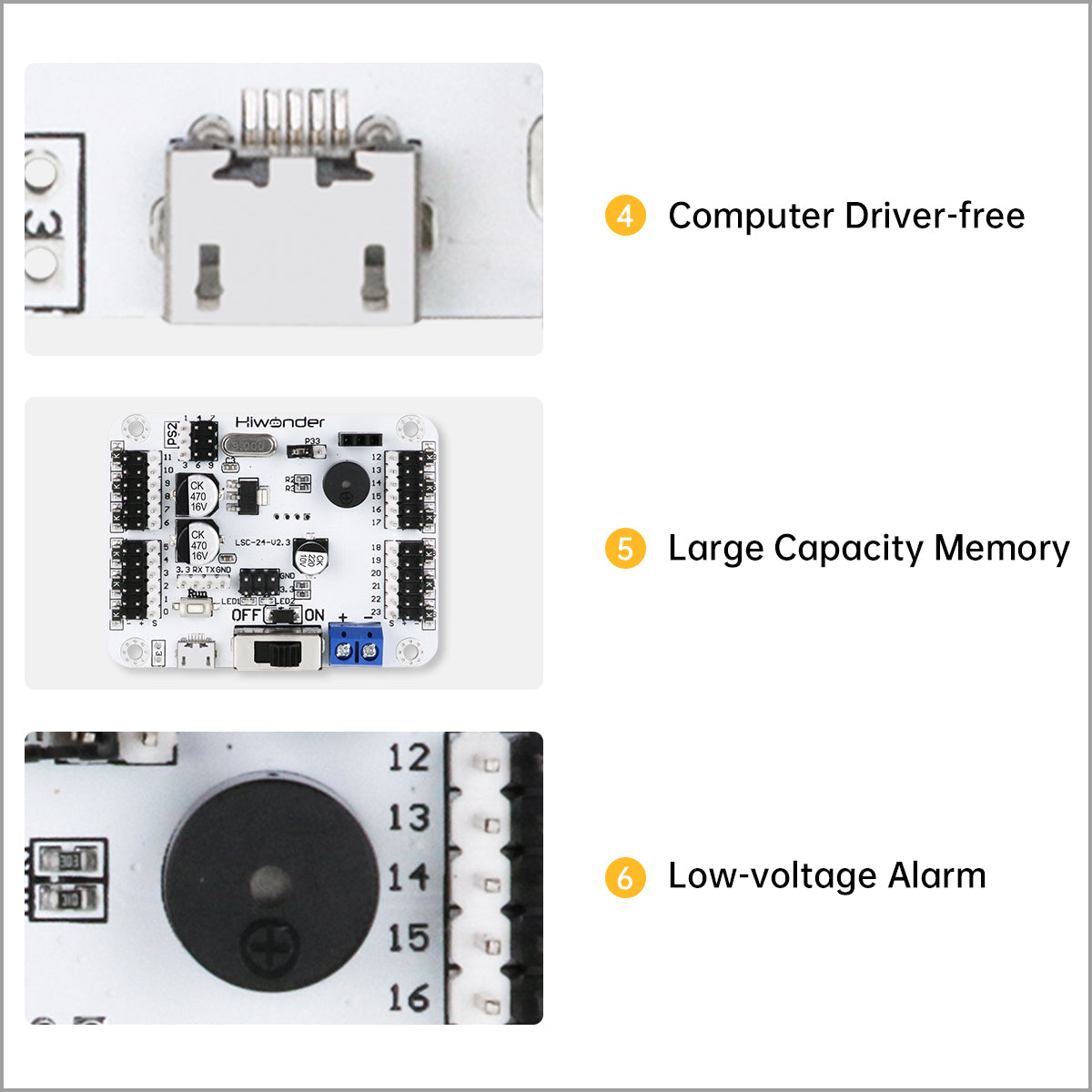 * Mobile App Control: Equipped with a Bluetooth module interface. By adding an optional Bluetooth module and using Hiwonder's mobile app, you can remotely control servo movement.