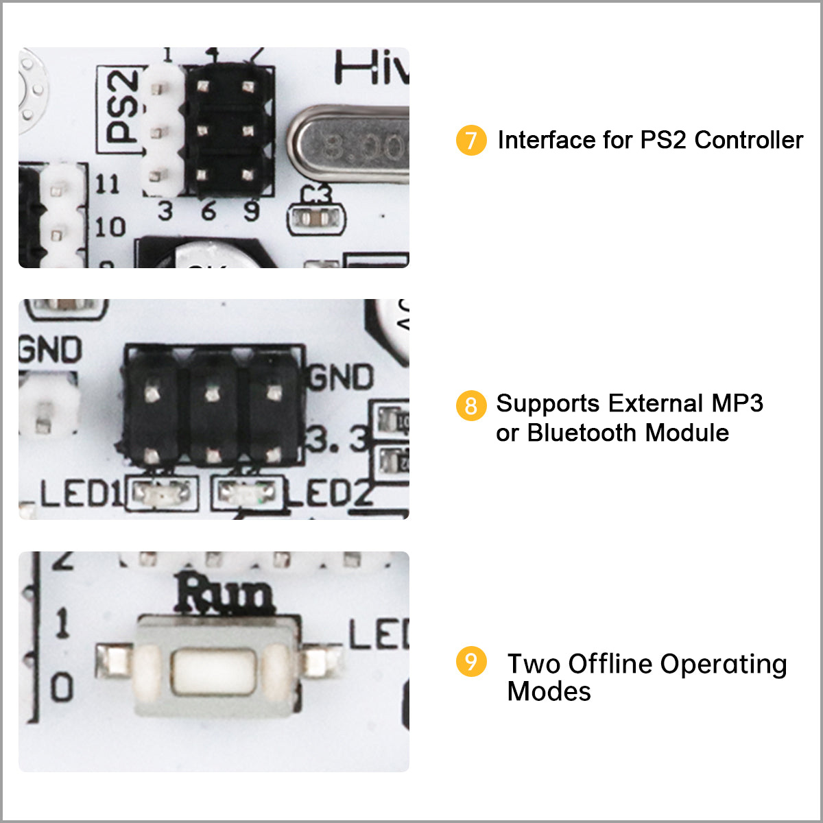 7. Interface For PS2 Controller: Supports for PS2 controller operation. It is simple and easy to use, with an effective control distance of about 10 meters.