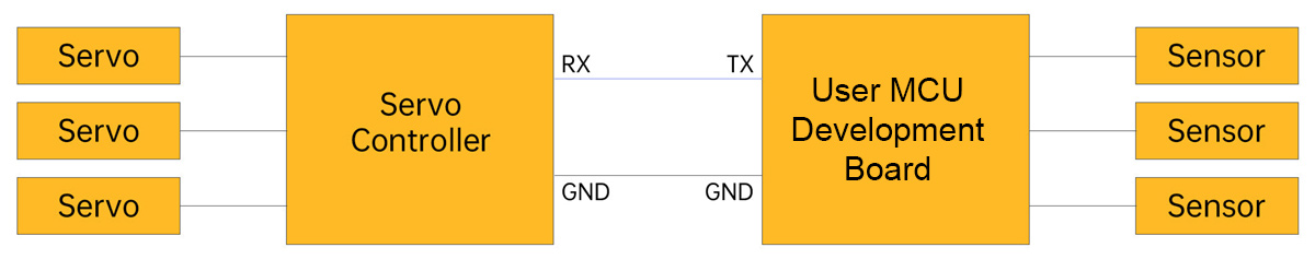 * The servo controller has a reserved serial communication interface, allowing TTL serial communication with other development boards. The development board can send instructions to the controller, enabling your robot to achieve intelligent control.