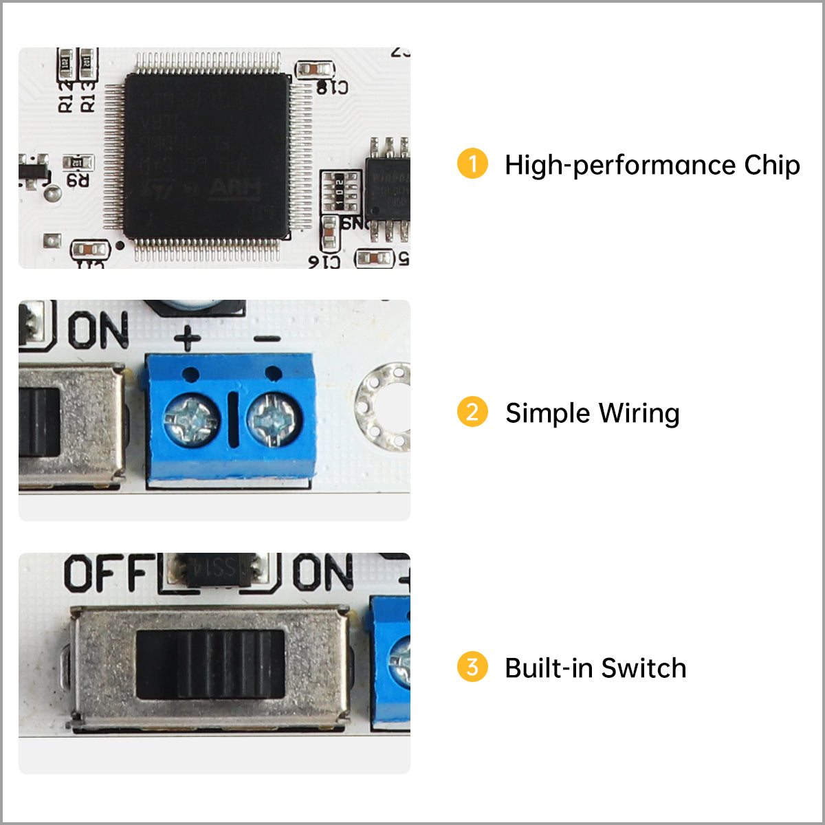 1. High-performance Chip: The CPU uses a high-performance STM32 microcontroller with a Cortex-M3 core for ARM, enabling precise motion control with adjustable speed.