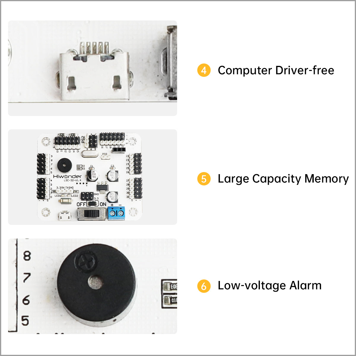 * Mobile App Control: Equipped with a Bluetooth module interface. By adding an optional Bluetooth module and using Hiwonder's mobile app, you can remotely control servo movement.