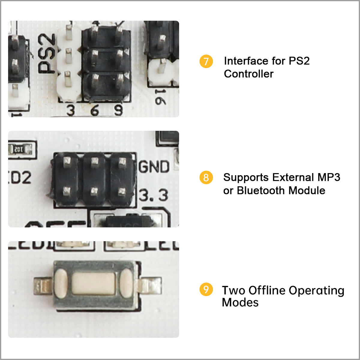 7. Interface For PS2 Controller: Supports for PS2 controller operation, simple and convenient, with an effective control distance of about 10 meters.