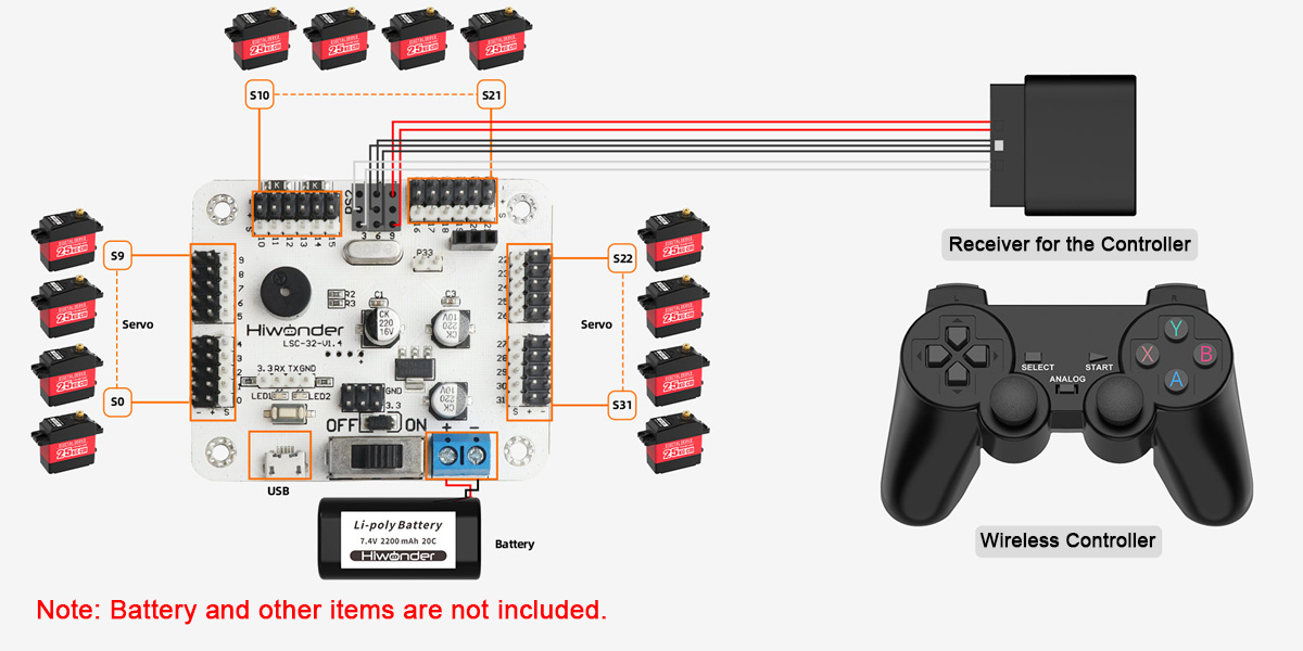 * Supports for PS2 Controller Control: Features a controller receiver interface for PS2. When used with Hiwonder's PS2 controller, it can be plugged directly into the control board with an effective range of about 10 meters.