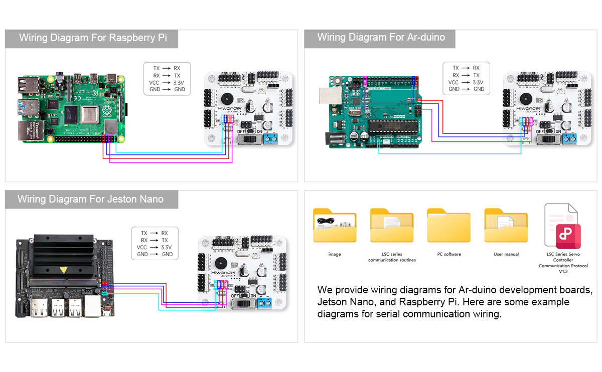 * Includes secondary development communication examples for Ar-duino, 51, STM32, Raspberry Pi, and Jetson Nano boards.