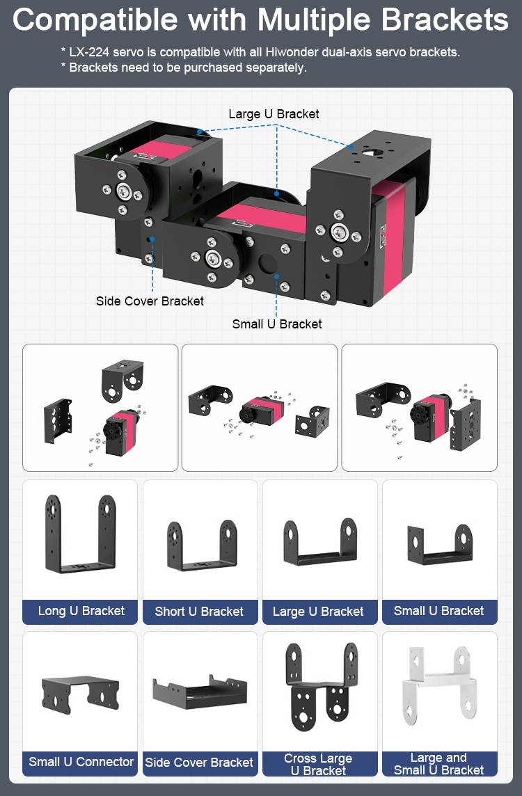 * LX-224 servo is compatible with all Hiwonder dual-axis servo brackets.