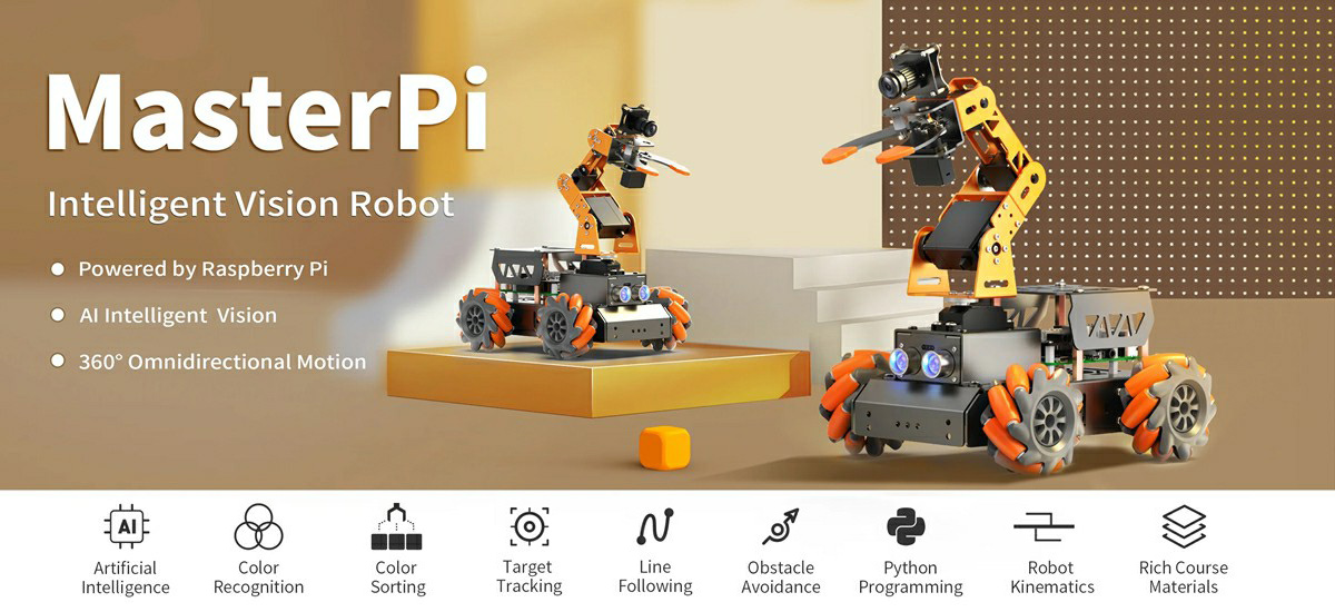 MasterPi is an intelligent vision robot developed based on Raspberry Pi 5/Raspberry Pi 4B. It features a Mecanum wheel chassis, a 4DOF robotic arm, and a high-definition camera. It can achieve functions such as color block sorting, target tracking, visual line following, and intelligent handling.