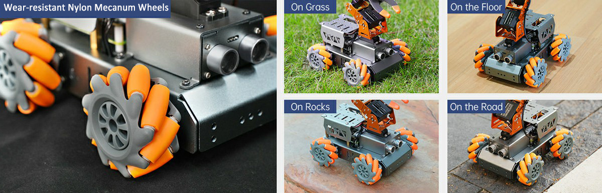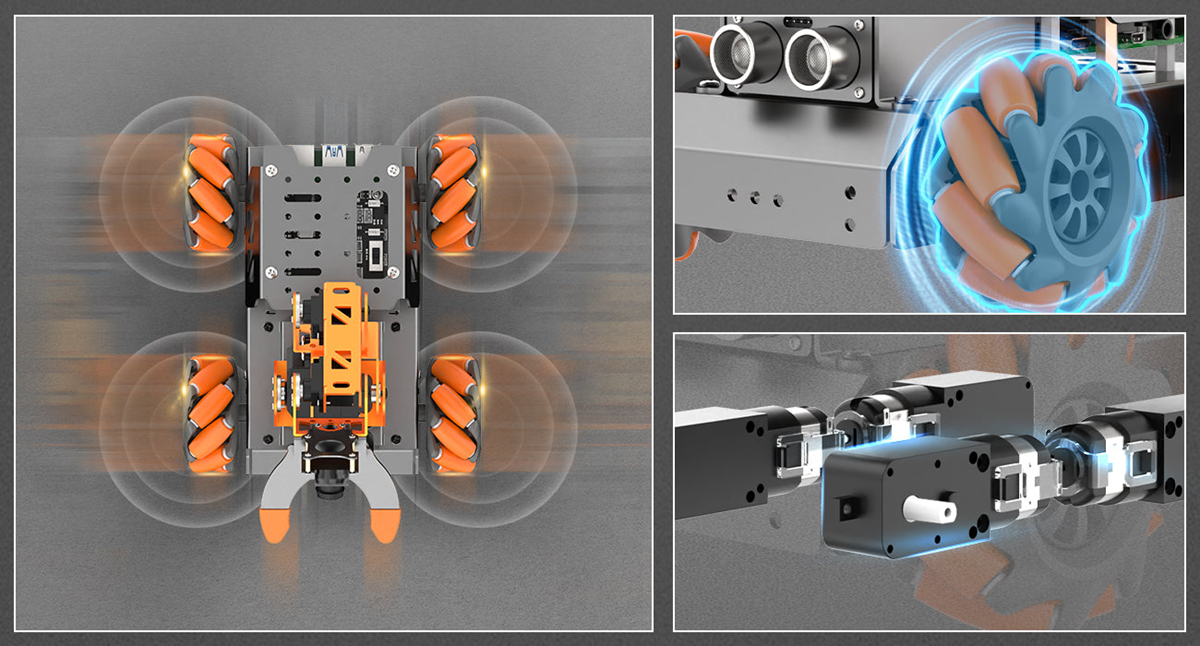 With 4 omnidirectional Mecanum wheels, MasterPi can achieve 360°