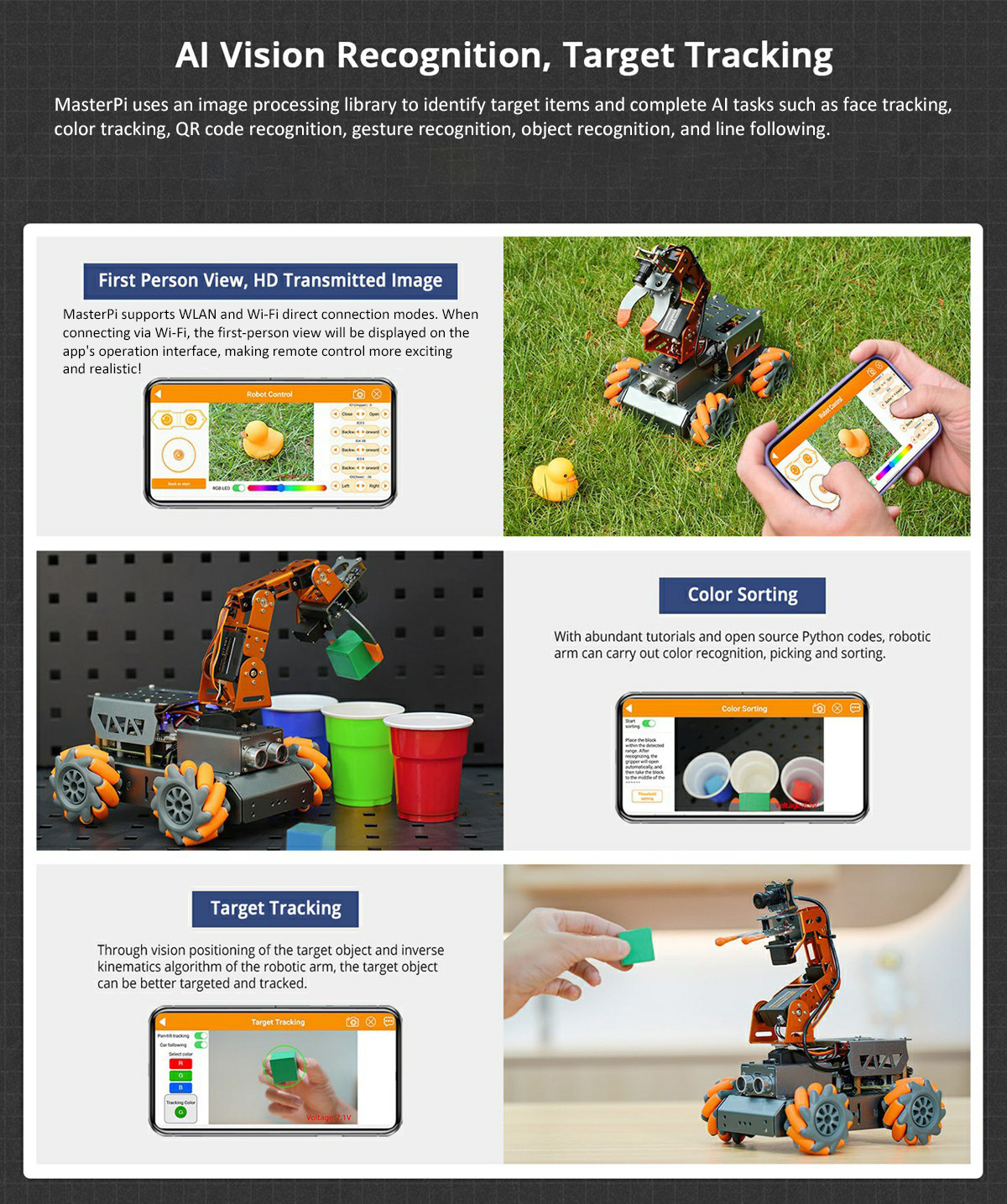 The MasterPi AI vision robot supports advanced image processing and
