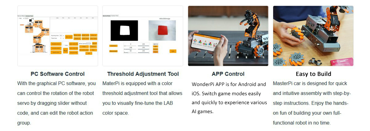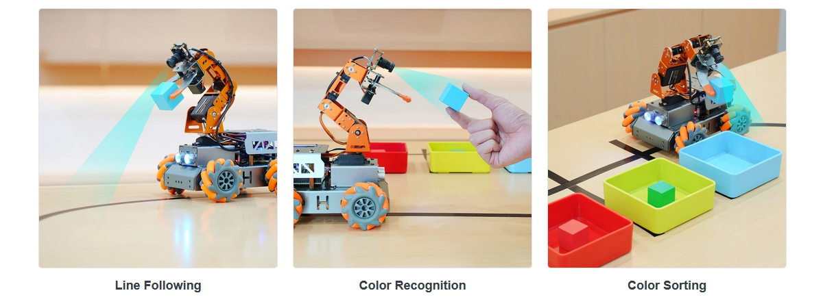 The MasterPi's body is equipped with a 4DOF robotic arm that can easily