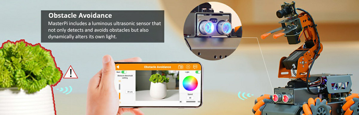 MasterPi is equipped with an RGB glowing ultrasonic sensor, allowing for control of light changes and enabling autonomous obstacle avoidance. It also supports the expansion of various sensors to achieve more integrated sensory functions.