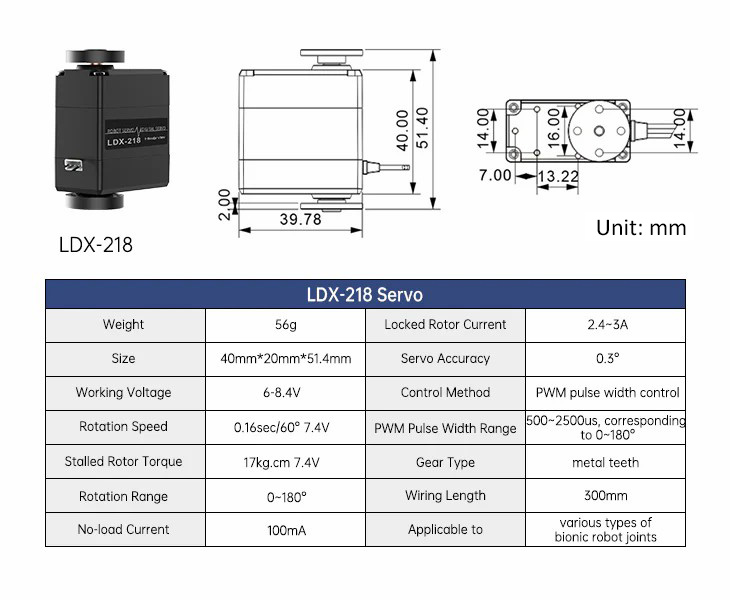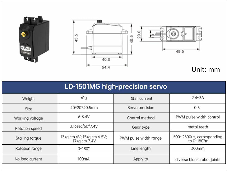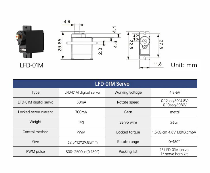 * Servo Model: LD-1501MG digital servo and LFD-01M micro servo
