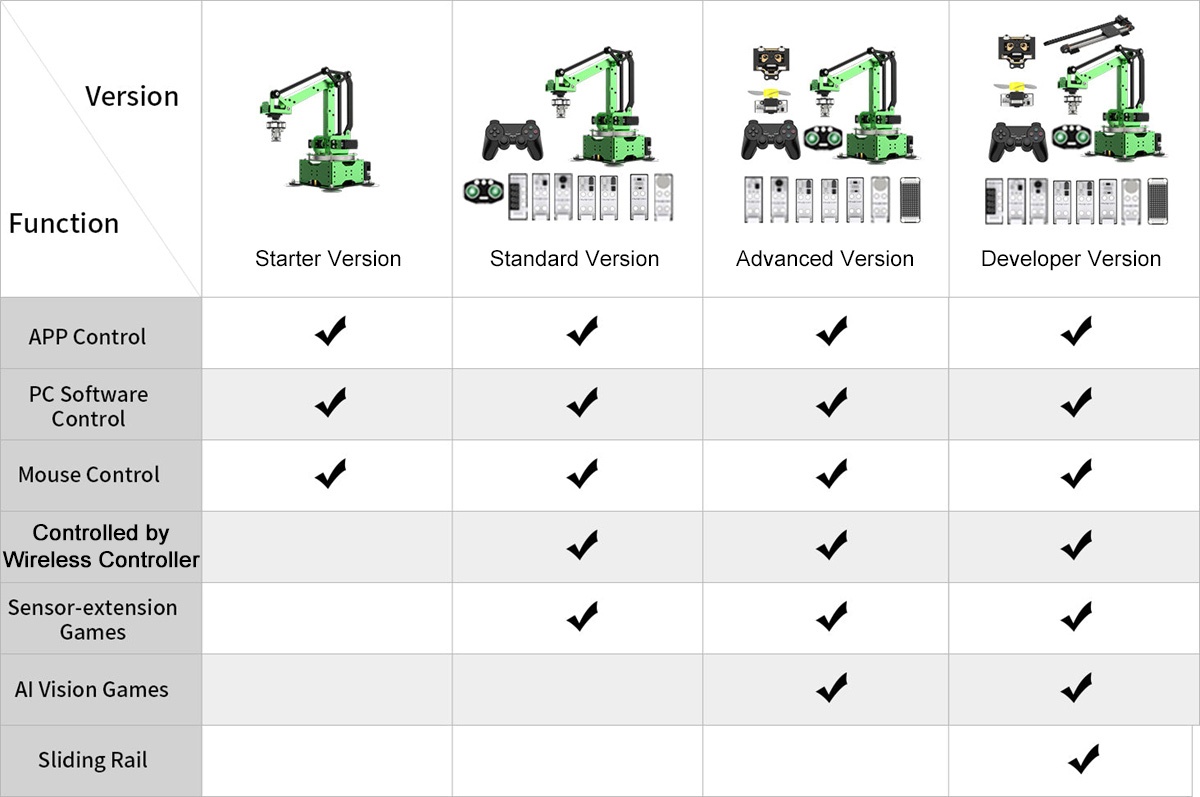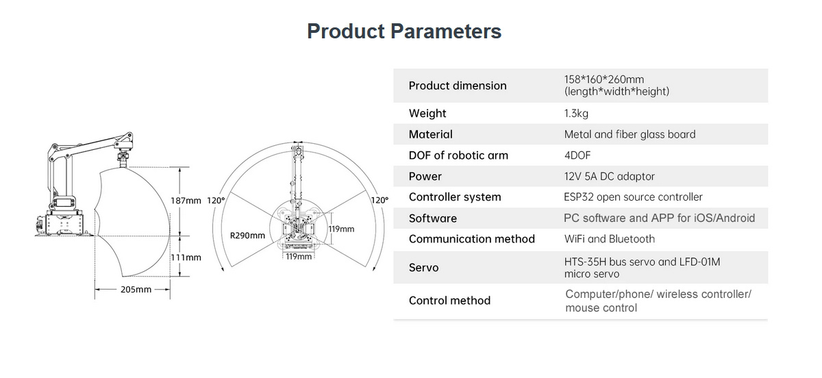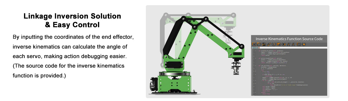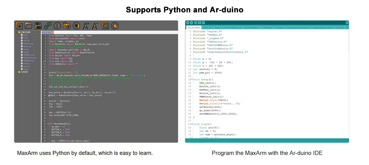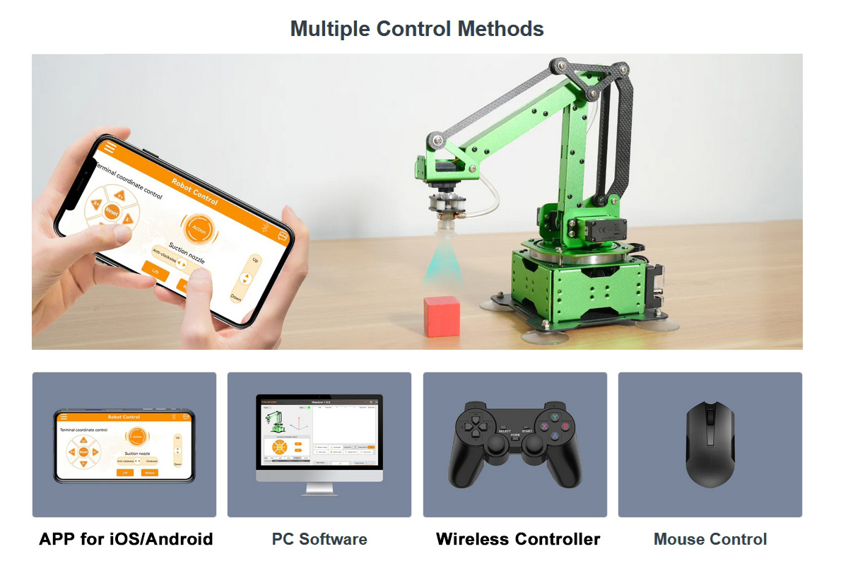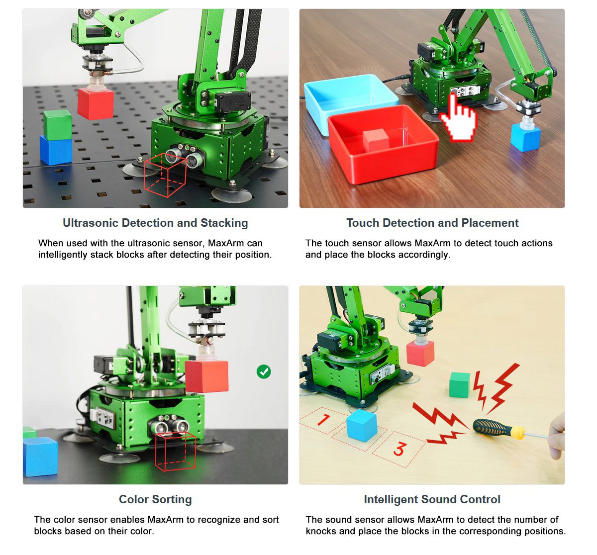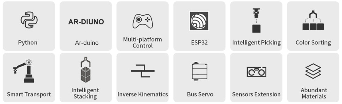 Using inverse kinematics technology, MaxArm can perform a variety of tasks such as object sorting, picking, transporting, and stacking. Supporting both Python and Ar-duino programming, as well as Wi-Fi and Bluetooth communication, MaxArm can be controlled via mobile app, PC software, wireless gamepad, or mouse.