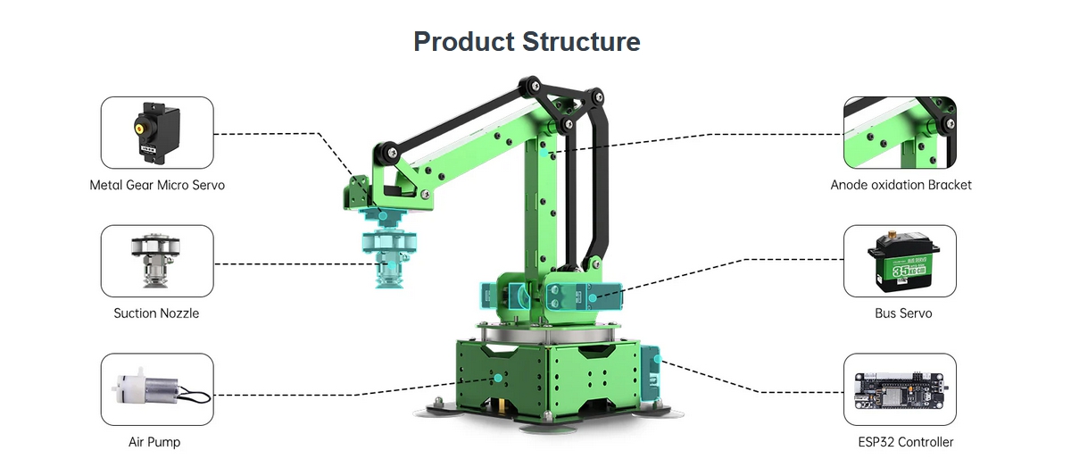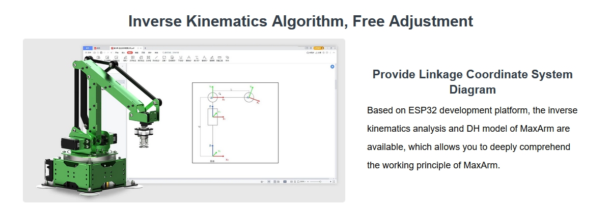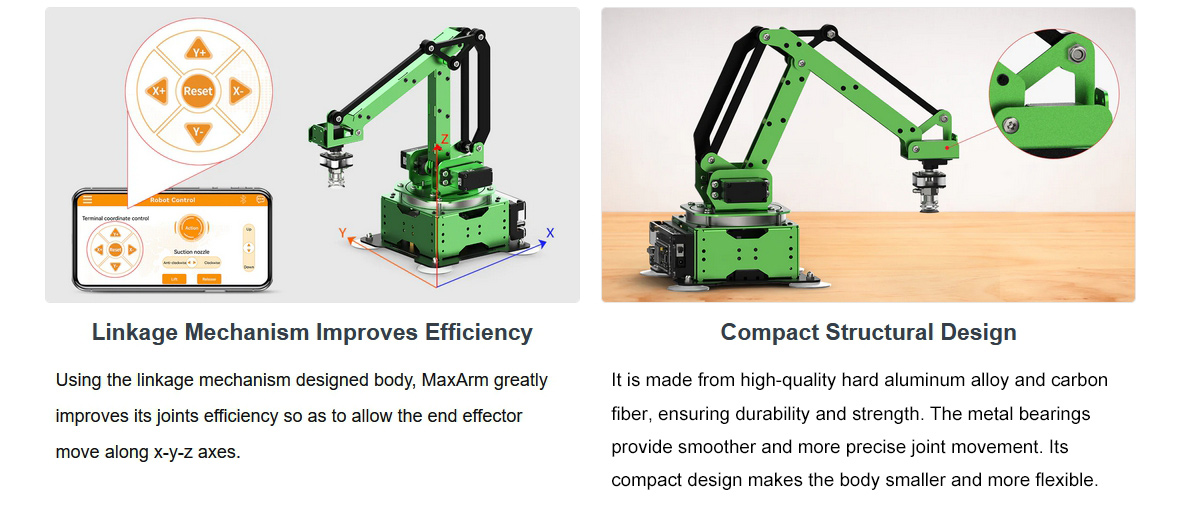Hiwonder MaxArm is an open-source robotic arm powered by the ESP32 microcontroller. It is an ideal desktop robotic arm for STEAM education and advanced robotics projects. Featuring a linkage mechanism design, the arm is equipped with high-quality smart bus servos and a suction nozzle.