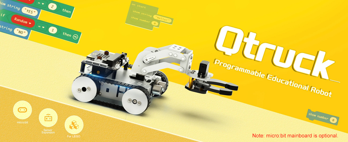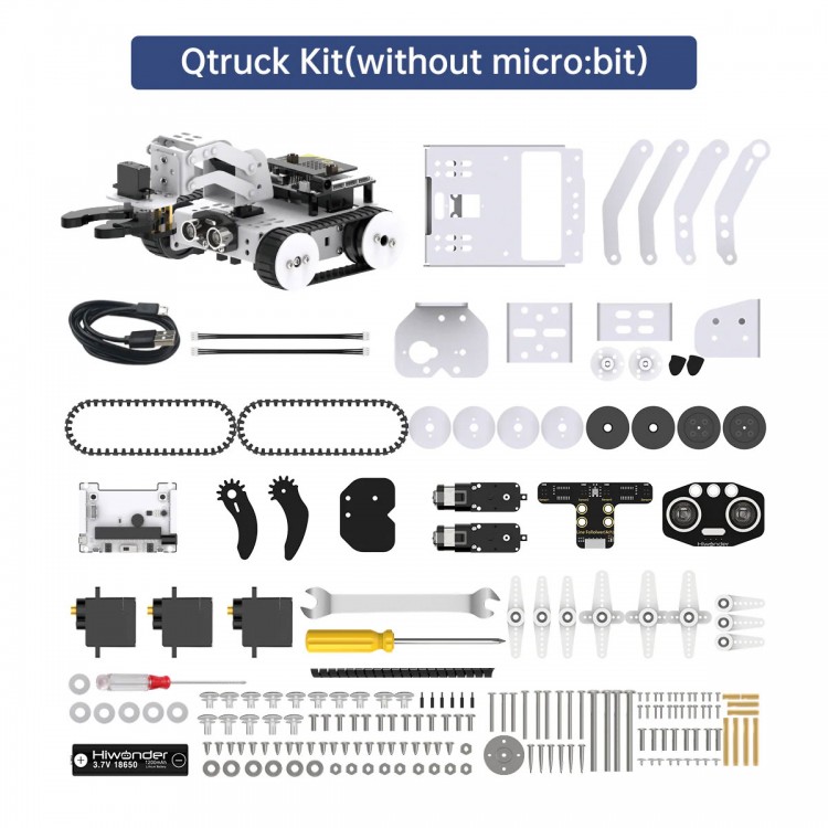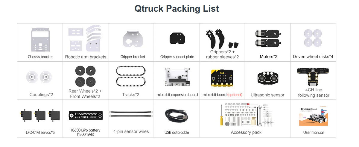 * Qtruck adopts a track chassis with a metal frame and a high-torque DC motor, making it a high-performance micro:bit vehicle.