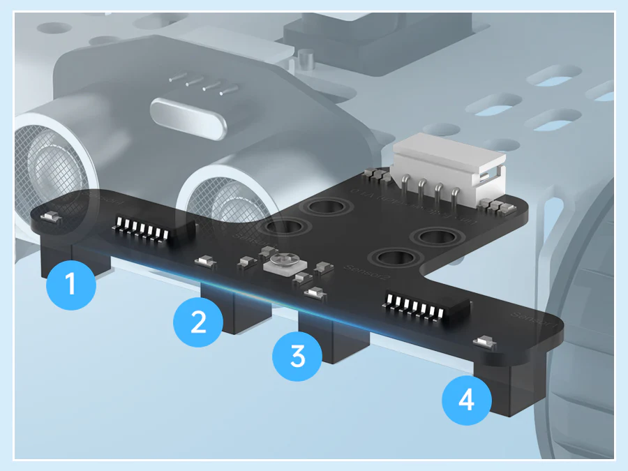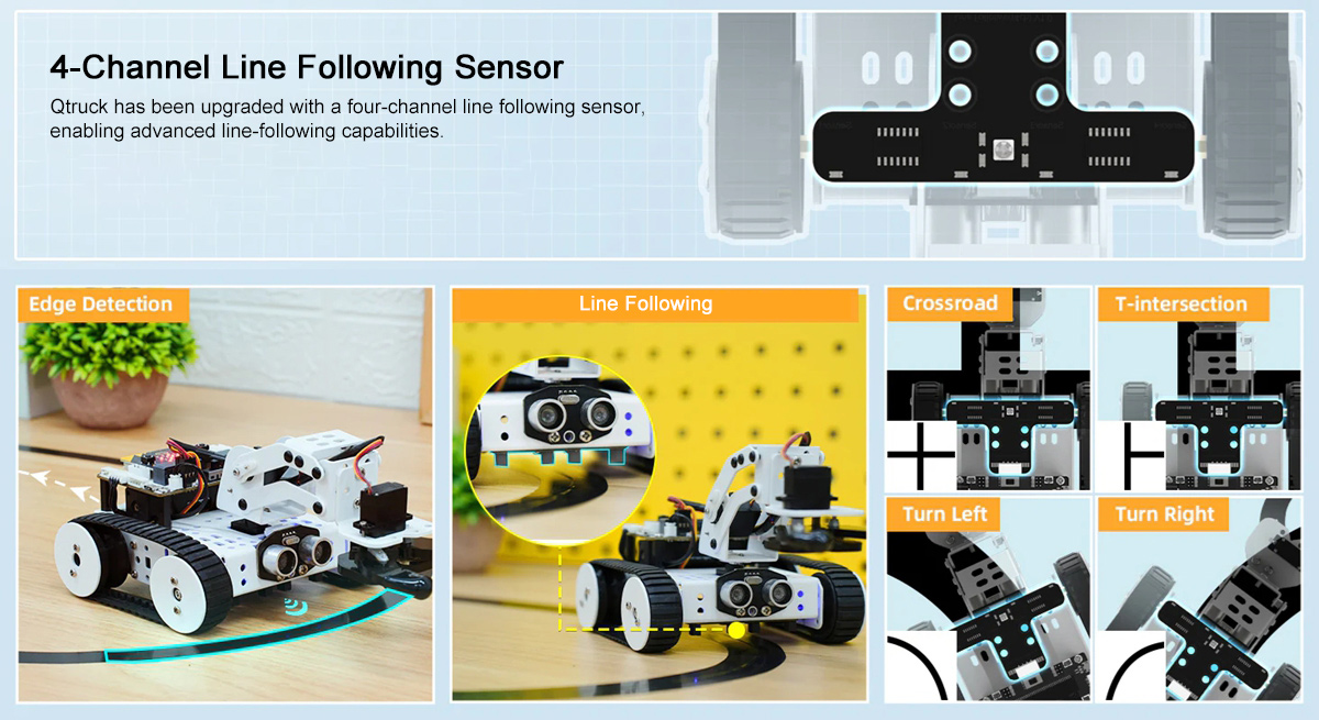 * With 4-channel infrared tracking, Qtruck can detect black lines even on sharp turns, enabling variable line following.
